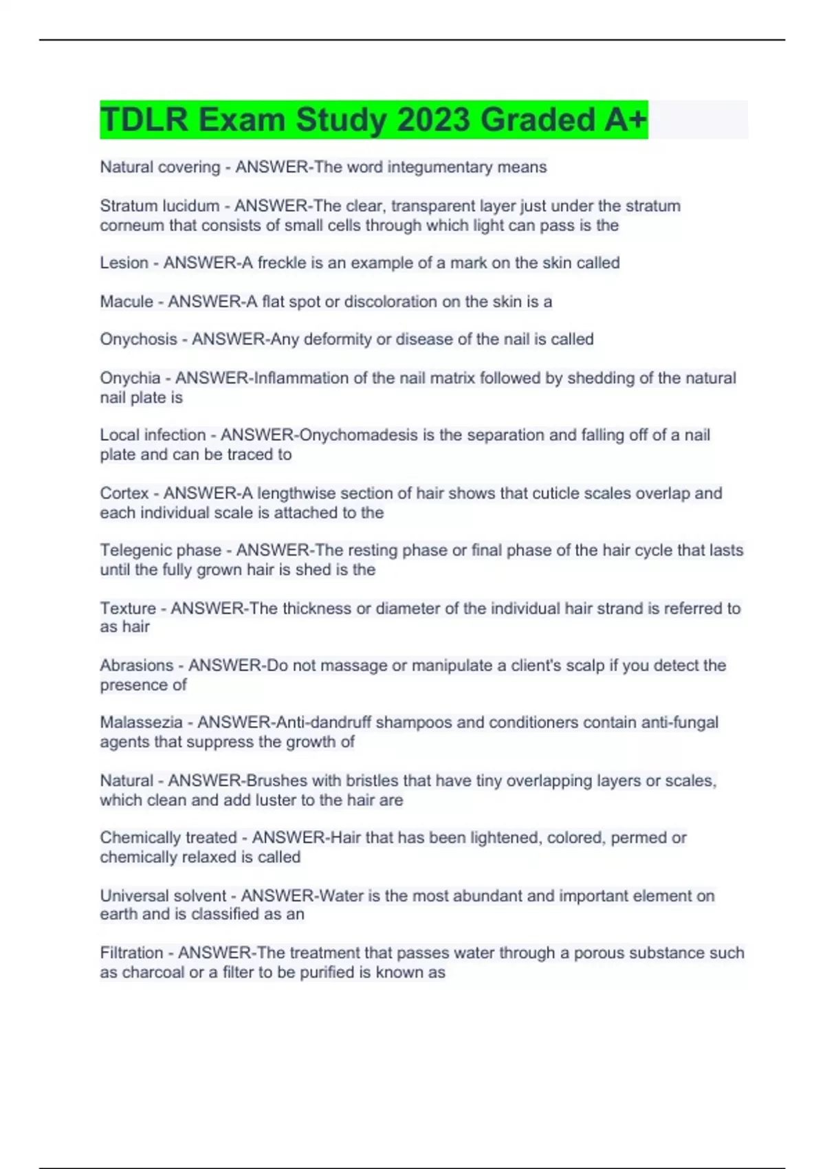 Natural covering - ANSWER-The word integumentary means Stratum lucidum - ANSWER-The clear, transparent layer just under the stratum corneum that consists of small cells through which light can pass is the Lesion - ANSWER-A freckle is an example of a mark on the skin called Macule - ANSWER-A flat spot or discoloration on the skin is a Onychosis - ANSWER-Any deformity or disease of the nail is called Onychia - ANSWER-Inflammation of the nail matrix followed by shedding of the natural nail plate is Local infection - ANSWER-Onychomadesis is the separation and falling off of a nail plate and can be traced to Cortex - ANSWER-A lengthwise section of hair shows that cuticle scales overlap and each individual scale is attached to the Telegenic phase - ANSWER-The resting phase or final phase of the hair cycle that lasts until the fully grown hair is shed is the Texture - ANSWER-The thickness or diameter of the individual hair strand is referred to as hair Abrasions - ANSWER-Do not massage or manipulate a client's scalp if you detect the presence of Malassezia - ANSWER-Anti-dandruff shampoos and conditioners contain anti-fungal agents that suppress the growth of Natural - ANSWER-Brushes with bristles that have tiny overlapping layers or scales, which clean and add luster to the hair are Chemically treated - ANSWER-Hair that has been lightened, colored, permed or chemically relaxed is called Universal solvent - ANSWER-Water is the most abundant and important element on earth and is classified as an Filtration - ANSWER-The treatment that passes water through a porous substance such as charcoal or a filter to be purified is known as Reference points - ANSWER-Surfaces on the head where the head changes, such as the ears, jawline, and occipital bone, are referred to as Design lines - ANSWER-Reference points in a haircut are used to established Head shape - ANSWER-Achieving balance within a design can be accomplished by understanding reference points and the Sections - ANSWER-The uniform working areas used for control during haircutting are called Guideline - ANSWER-A section of hair that determines the length the hair will be cut is the Traveling guide - ANSWER-The guideline where a small slice of a previous subsection is moved to the next position and becomes the new guideline is a Analyze the cost, determine how many pairs, ask about service agreement - ANSWER-Before purchasing shears, a stylist should Indentation - ANSWER-The point where curls of opposite directions meet, forming a recessed area called Wiry or curly - ANSWER-The hair type that is very resistant to hair pressing and requires more heat and pressureis Client's hair texture - ANSWER-During the consultation, the stylist must pay special attention to the Pick with rounded teeth - ANSWER-Which tool is useful for lifting and separating textured hair? Wig - ANSWER-The artificial hair covering that completely conceals the client's hair is a Wefts - ANSWER-Human or artificial hair that is woven into long strips is called Machine made - ANSWER-The least expensive wig option is Low - ANSWER-When using heat on human hair wigs, the temperature setting on the styling tool should be Bonding - ANSWER-The technique that involves attaching human hair or single strands with adhesive or glue is Soften and swell the shaft - ANSWER-Chemical hair texturizers temporarily raise the pH of the hair in order to Brain - ANSWER-The largest and most complex nerve tissue of the body is the Zygomatic bones - ANSWER-The cheekbones are also called the malar bones or OSHA - ANSWER-Universal precautions for bloodborne pathogens are regulated by Mildew - ANSWER-Which fungus affects plants or grows on inanimate objects but does not cause human infections in the salon? Round - ANSWER-The medulla, the innermost layer of the hair, is composed of cells that are Hair follicle - ANSWER-Hair is composed of protein that grows from cells originating within the Procrastination - ANSWER-A symptom of taking on too much, which, in turn, is a symptom of faulty organization, is Reflexology - ANSWER-A unique method of applying pressure with thumb and index fingers to the hands and feet is Impaired foot circulation - ANSWER-Hot paraffin baths should not be given to clients with Effleurage - ANSWER-The relaxing massage movement that should be perfected, varied and expertly used during a manicure is 45 degree angle - ANSWER-To bevel the nail, hold a medium-grit abrasive board at a Aggressive - ANSWER-As a rule of thumb, the lower the grit on an abrasive nail file, the more Tongs - ANSWER-Implements should be removed from a disinfected solution using Toupee - ANSWER-A small wig used to cover the top or crown of the head is a Turned hair - ANSWER-Hair that is arranged so that the cuticles of all the hair strands slope in the same direction is India and Asia - ANSWER-Most human hair used commercially comes from Divide the panel into 3 even strands - ANSWER-Step 6 is creating basic cornrows is