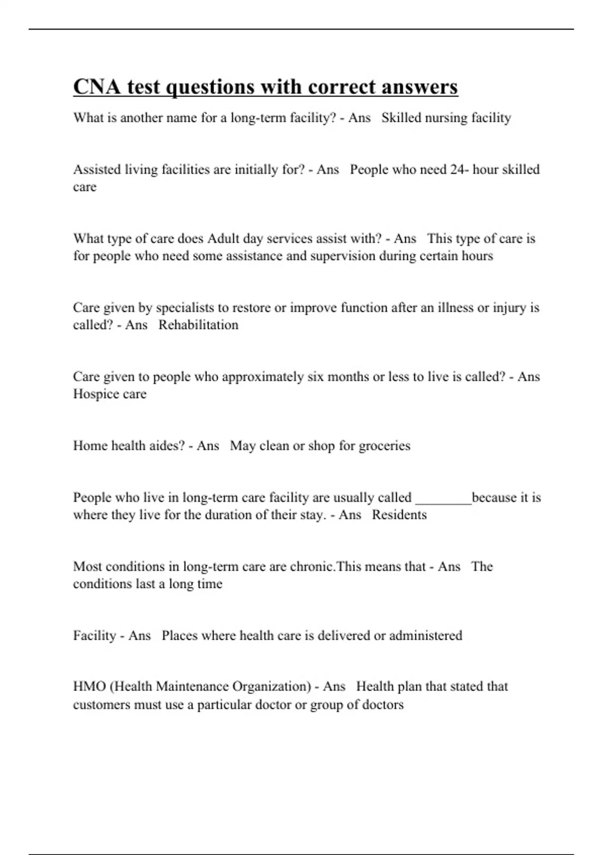 What is another name for a long-term facility? - Ans Skilled nursing facility Assisted living facilities are initially for? - Ans People who need 24- hour skilled care What type of care does Adult day services assist with? - Ans This type of care is for people who need some assistance and supervision during certain hours Care given by specialists to restore or improve function after an illness or injury is called? - Ans Rehabilitation Care given to people who approximately six months or less to live is called? - Ans Hospice care Home health aides? - Ans May clean or shop for groceries People who live in long-term care facility are usually called ________because it is where they live for the duration of their stay. - Ans Residents Most conditions in long-term care are chronic.This means that - Ans The conditions last a long time Facility - Ans Places where health care is delivered or administered HMO (Health Maintenance Organization) - Ans Health plan that stated that customers must use a particular doctor or group of