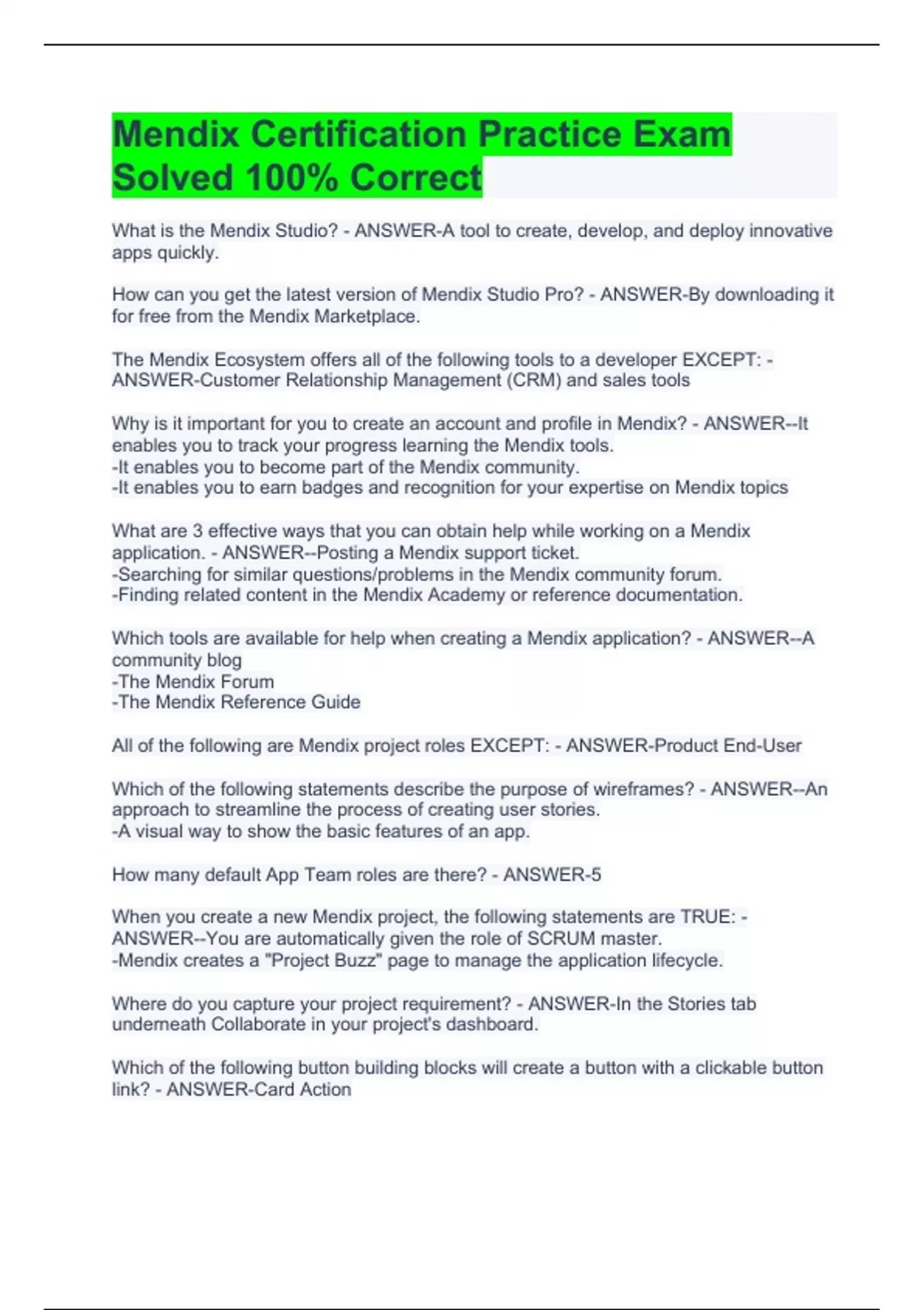 What is the Mendix Studio? - ANSWER-A tool to create, develop, and deploy innovative apps quickly. How can you get the latest version of Mendix Studio Pro? - ANSWER-By downloading it for free from the Mendix Marketplace. The Mendix Ecosystem offers all of the following tools to a developer EXCEPT: - ANSWER-Customer Relationship Management (CRM) and sales tools Why is it important for you to create an account and profile in Mendix? - ANSWER--It enables you to track your progress learning the Mendix tools. -It enables you to become part of the Mendix community. -It enables you to earn badges and recognition for your expertise on Mendix topics What are 3 effective ways that you can obtain help while working on a Mendix application. - ANSWER--Posting a Mendix support ticket. -Searching for similar questions/problems in the Mendix community forum. -Finding related content in the Mendix Academy or reference documentation. Which tools are available for help when creating a Mendix application? - ANSWER--A community blog -The Mendix Forum -The Mendix Reference Guide All of the following are Mendix project roles EXCEPT: - ANSWER-Product End-User Which of the following statements describe the purpose of wireframes? - ANSWER--An approach to streamline the process of creating user stories. -A visual way to show the basic features of an app. How many default App Team roles are there? - ANSWER-5 When you create a new Mendix project, the following statements are TRUE: - ANSWER--You are automatically given the role of SCRUM master. -Mendix creates a "Project Buzz" page to manage the application lifecycle. Where do you capture your project requirement? - ANSWER-In the Stories tab underneath Collaborate in your project's dashboard. Which of the following button building blocks will create a button with a clickable button link? - ANSWER-Card Action