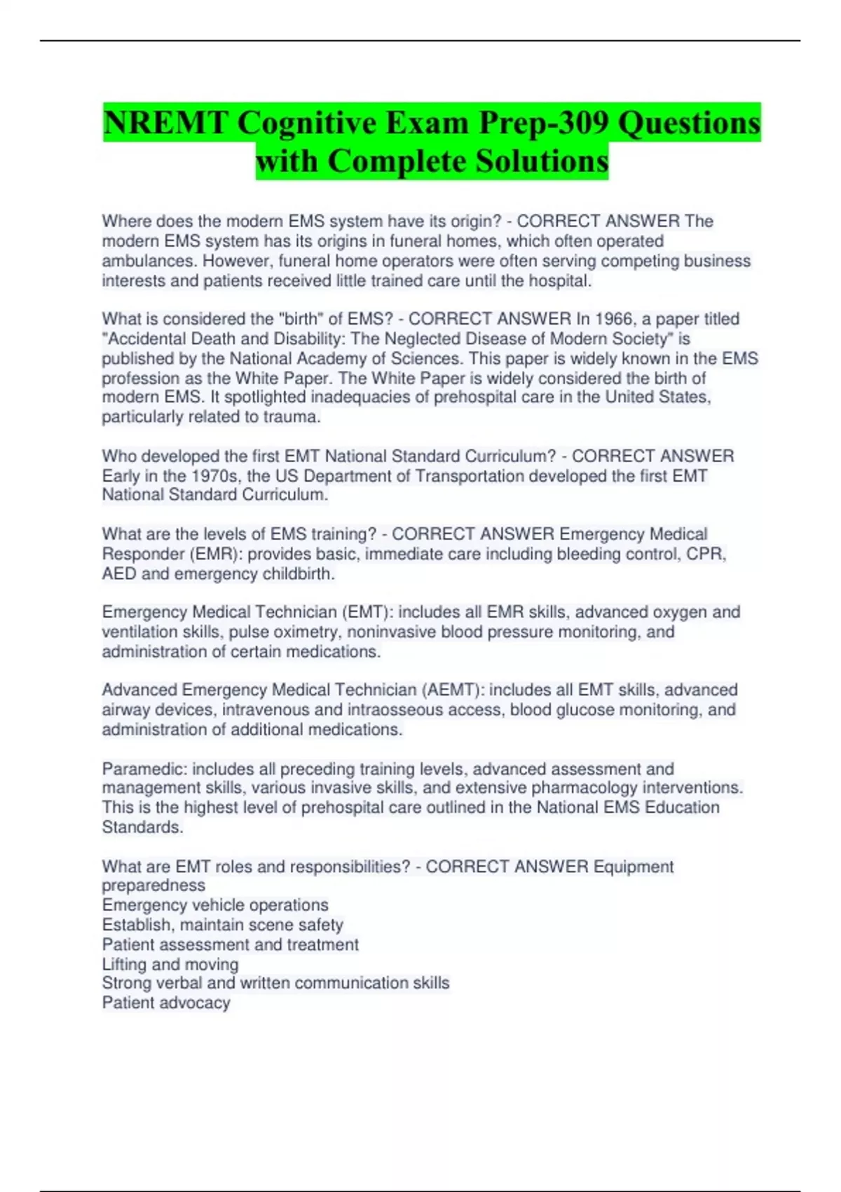 NREMT Cognitive Exam Prep-309 Questions with Complete Solutions Where does the modern EMS system have its origin? - CORRECT ANSWER The modern EMS system has its origins in funeral homes, which often operated ambulances. However, funeral home operators were often serving competing business interests and patients received little trained care until the hospital. What is considered the "birth" of EMS? - CORRECT ANSWER In 1966, a paper titled "Accidental Death and Disability: The Neglected Disease of Modern Society" is published by the National Academy of Sciences. This paper is widely known in the EMS profession as the White Paper. The White Paper is widely considered the birth of modern EMS. It spotlighted inadequacies of prehospital care in the United States, particularly related to trauma. Who developed the first EMT National Standard Curriculum? - CORRECT ANSWER Early in the 1970s, the US Department of Transportation developed the first EMT National Standard Curriculum. What are the levels of EMS training? - CORRECT ANSWER Emergency Medical Responder (EMR): provides basic, immediate care including bleeding control, CPR, AED and emergency childbirth. Emergency Medical Technician (EMT): includes all EMR skills, advanced oxygen and ventilation skills, pulse oximetry, noninvasive blood pressure monitoring, and administration of certain medications. Advanced Emergency Medical Technician (AEMT): includes all EMT skills, advanced airway devices, intravenous and intraosseous access, blood glucose monitoring, and administration of additional medications. Paramedic: includes all preceding training levels, advanced assessment and management skills, various invasive skills, and extensive pharmacology interventions. This is the highest level of prehospital care outlined in the National EMS Education Standards. What are EMT roles and responsibilities? - CORRECT ANSWER Equipment preparedness Emergency vehicle operations Establish, maintain scene safety Patient assessment and treatment Lifting and moving Strong verbal and written communication skills Patient advocacy Professional development Quality improvement Illness and injury prevention Maintain certification/licensure What is the role of the medical director? - CORRECT ANSWER The medical director is a physician responsible for providing medical oversight. The medical director oversees quality improvement. What are the two types of medical direction? - CORRECT ANSWER Online medical direction: direct contact between the physician and EMT via or radio.