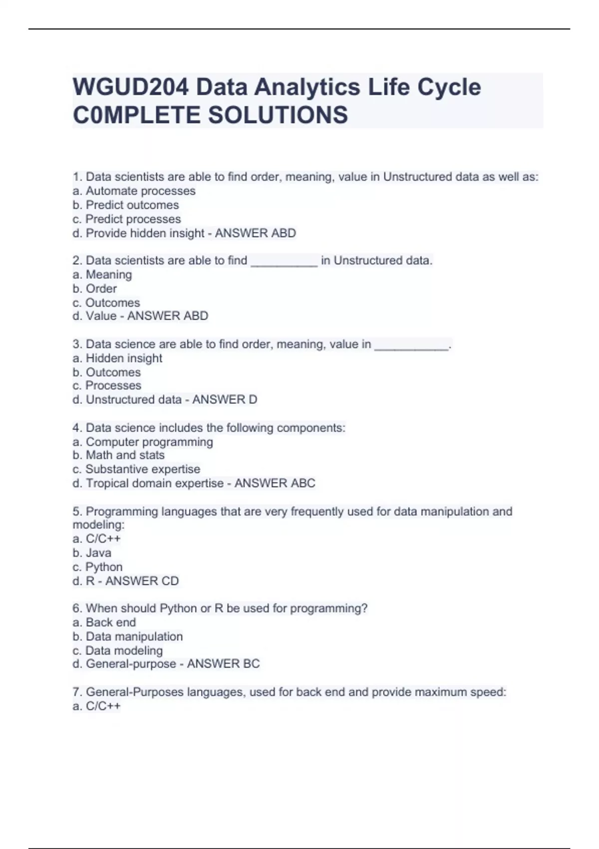 1. Data scientists are able to find order, meaning, value in Unstructured data as well as: a. Automate processes b. Predict outcomes c. Predict processes d. Provide hidden insight - ANSWER ABD 2. Data scientists are able to find __________ in Unstructured data. a. Meaning b. Order c. Outcomes d. Value - ANSWER ABD 3. Data science are able to find order, meaning, value in ___________. a. Hidden insight b. Outcomes c. Processes d. Unstructured data - ANSWER D 4. Data science includes the following components: a. Computer programming b. Math and stats c. Substantive expertise d. Tropical domain expertise - ANSWER ABC 5. Programming languages that are very frequently used for data manipulation and modeling: a. C/C++ b. Java c. Python d. R - ANSWER CD 6. When should Python or R be used for programming? a. Back end b. Data manipulation c. Data modeling d. General-purpose - ANSWER BC 7. General-Purposes languages, used for back end and provide maximum speed: a. C/C++ b. Java c. Python d. R - ANSWER AB 8. When should C/C++ or Java be used for programming? a. Back end b. Data manipulation c. Data modeling d. Provide maximum speed - ANSWER AD 9. What defines back end? a. Foundational elements of computer programming b. Foundational elements of data analytics c. Foundational elements of data modeling d. Foundational elements of data science - ANSWER D 10. Language for working with relational databases to do queries and data manipulation: a. Excel b. SQL c. Tableau d. TensorFlow - ANSWER B 11. What does SQL stand for? a. Standard query language b. Standard question language c. Structured query language d. Structured question language - ANSWER C 12. When should SQL be used? a. Data manipulation b. Data modeling c. Data queries d. Working with relational database - ANSWER ACD 13. Packages that can b