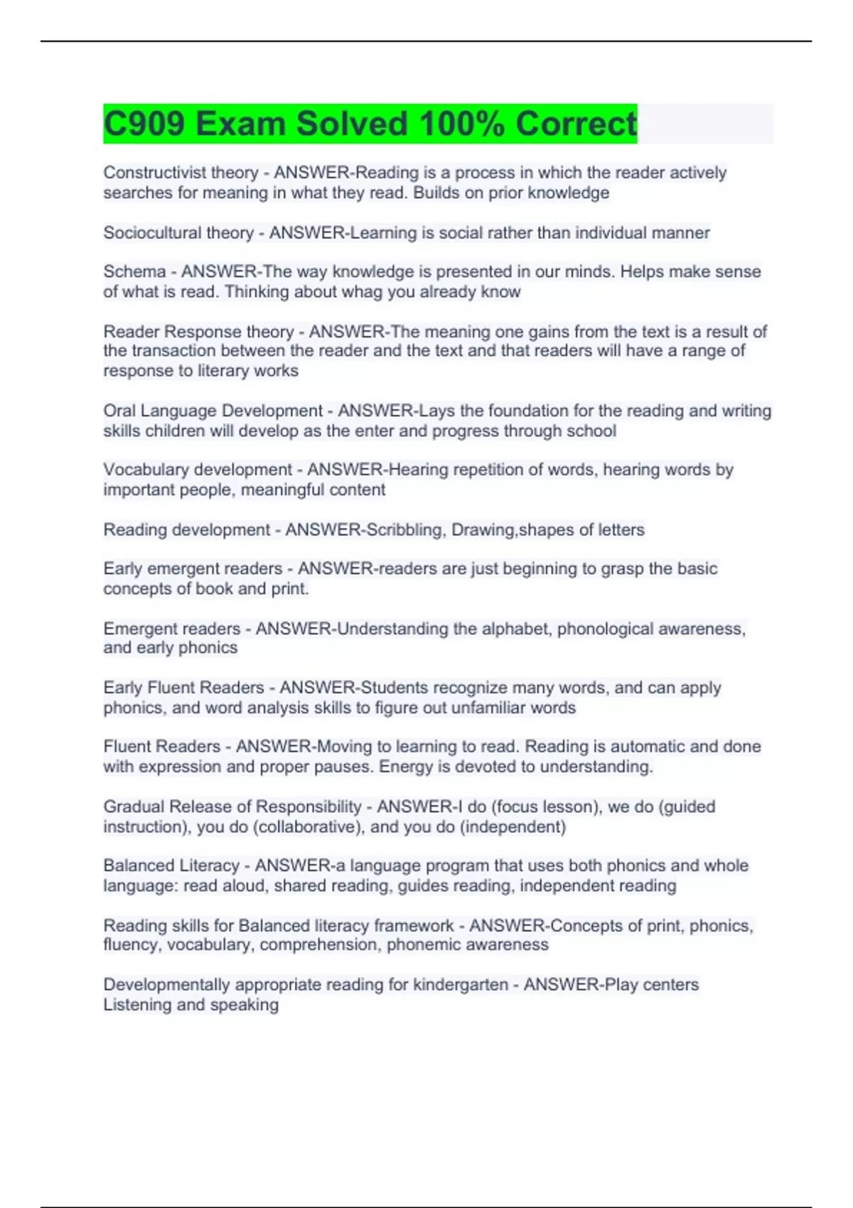 Constructivist theory - ANSWER-Reading is a process in which the reader actively searches for meaning in what they read. Builds on prior knowledge Sociocultural theory - ANSWER-Learning is social rather than individual manner Schema - ANSWER-The way knowledge is presented in our minds. Helps make sense of what is read. Thinking about whag you already know Reader Response theory - ANSWER-The meaning one gains from the text is a result of the transaction between the reader and the text and that readers will have a range of response to literary works Oral Language Development - ANSWER-Lays the foundation for the reading and writing skills children will develop as the enter and progress through school Vocabulary development - ANSWER-Hearing repetition of words, hearing words by important people, meaningful content Reading development - ANSWER-Scribbling, Drawing,shapes of letters Early emergent readers - ANSWER-readers are just beginning to grasp the basic concepts of book and print. Emergent readers - ANSWER-Understanding the alphabet, phonological awareness, and early phonics Early Fluent Readers - ANSWER-Students recognize many words, and can apply phonics, and word analysis skills to figure out unfamiliar words Fluent Readers - ANSWER-Moving to learning to read. Reading is automatic and done with expression and proper pauses. Energy is devoted to understanding. Gradual Release of Responsibility - ANSWER-I do (focus lesson), we do (guided instruction), you do (collaborative), and you do (independent) Balanced Literacy - ANSWER-a language program that uses both phonics and whole language: read aloud, shared reading, guides reading, independent reading Reading skills for Balanced literacy framework - ANSWER-Concepts of print, phonics, fluency, vocabulary, comprehension, phonemic awareness Developmentally appropriate reading for kindergarten - ANSWER-Play centers Listening and speaking