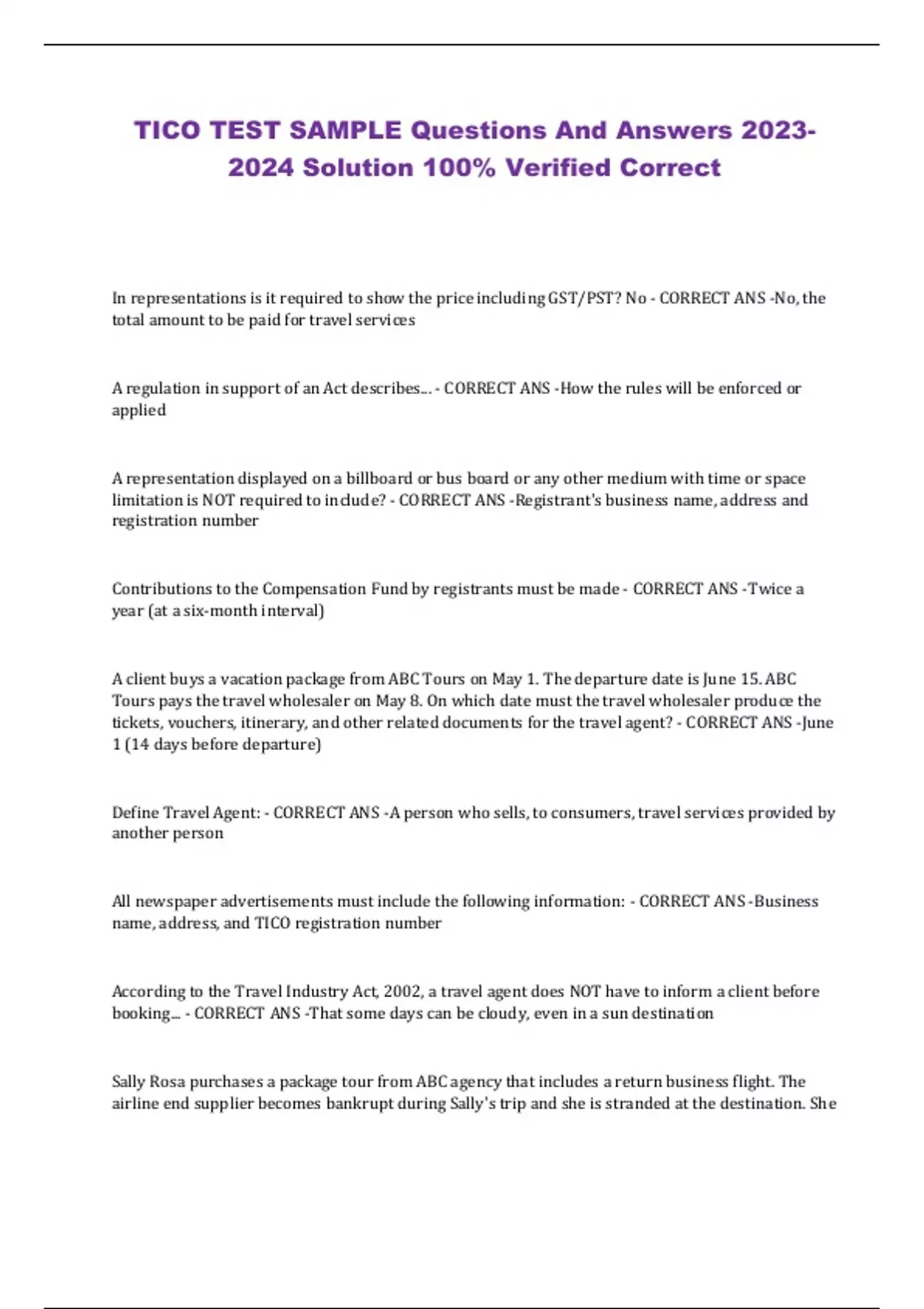 TICO TEST SAMPLE Questions And Answers Solution 100% Verified Correct In representations is it required to show the price including GST/PST? No - CORRECT ANS -No, the total amount to be paid for travel services A regulation in support of an Act describes... - CORRECT ANS -How the rules will be enforced or applied A representation displayed on a billboard or bus board or any other medium with time or space limitation is NOT required to include? - CORRECT ANS -Registrant's business name, address and registration number Contributions to the Compensation Fund by registrants must be made - CORRECT ANS -Twice a year (at a six-month interval) A client buys a vacation package from ABC Tours on May 1. The departure date is June 15. ABC Tours pays the travel wholesaler on May 8. On which date must the travel wholesaler produce the tickets, vouchers, itinerary, and other related documents for the travel agent? - CORRECT ANS -June 1 (14 days before departure) Define Travel Agent: - CORRECT ANS -A person who sells, to consumers, travel services provided by another person All newspaper advertisements must include the following information: - CORRECT ANS -Business name, address, and TICO registration number According to the Travel Industry Act, 2002, a travel agent does NOT have to inform a client before booking... - CORRECT ANS -That some days can be cloudy, even in a sun destination