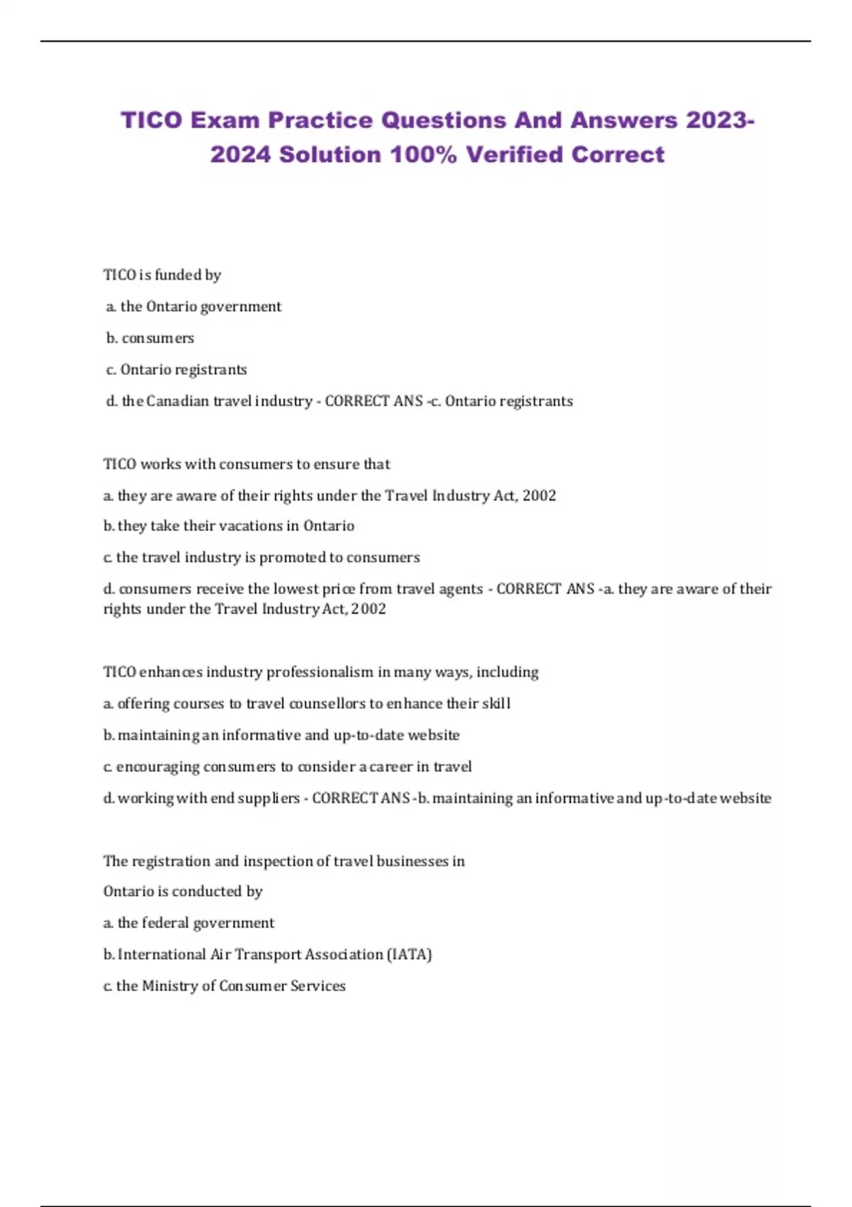 TICO Exam Practice Questions And Answers Solution 100% Verified Correct TICO is funded by a. the Ontario government b. consumers c. Ontario registrants d. the Canadian travel industry - CORRECT ANS -c. Ontario registrants TICO works with consumers to ensure that a. they are aware of their rights under the Travel Industry Act, 2002 b. they take their vacations in Ontario c. the travel industry is promoted to consumers d. consumers receive the lowest price from travel agents - CORRECT ANS -a. they are aware of their rights under the Travel Industry Act, 2002 TICO enhances industry professionalism in many ways, including a. offering courses to travel counsellors to enhance their skill b. maintaining an informative and up-to-date website c. encouraging consumers to consider a career in travel d. working with end suppliers - CORRECT ANS -b. maintaining an informative and up-to-date website The registration and inspection of travel businesses in Ontario is conducted by a. the federal government b. International Air Transport Association (IATA) c. the Ministry of Consumer Services d. the Travel Industry Council of Ontario (TICO) - CORRECT ANS -d. the Travel Industry Council of Ontario (TICO) The Travel Industry Act, 2002 defines travel agent as a. a person who owns and operates a travel service b. a person who sells travel services provided by another person c. a person who sells travel services to other travel agents and wholesalers d. a person who conducts sightseeing tours - CORRECT ANS -b. a person who sells travel services provided by another person