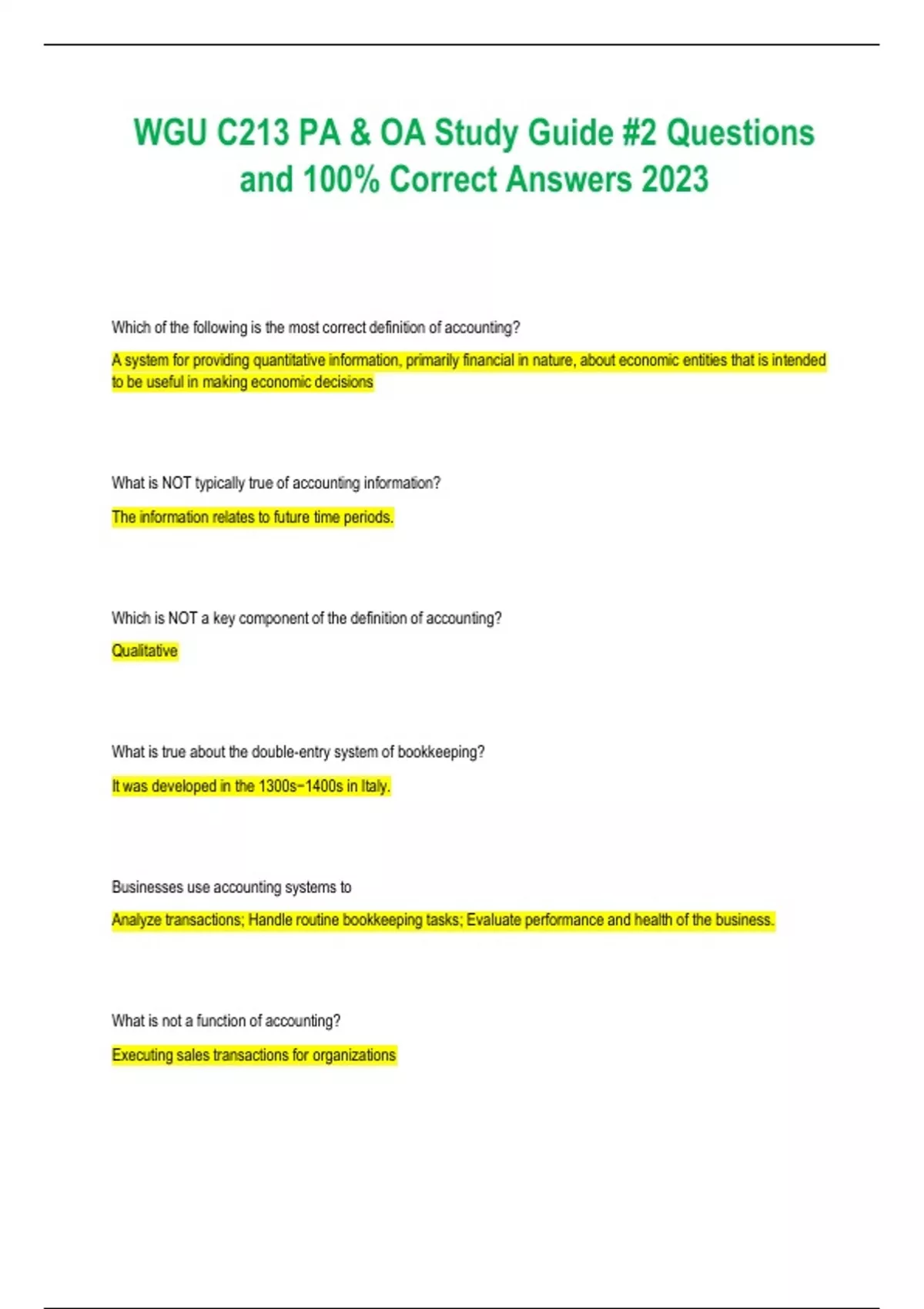 WGU C213 PA & OA Study Guide #2 Questions and 100% Correct Answers 2023 Which of the following is the most correct definition of accounting? A system for providing quantitative information, primarily financial in nature, about economic entities that is intended to be useful in making economic decisions What is NOT typically true of accounting information? The information relates to future time periods. Which is NOT a key component of the definition of accounting? Qualitative What is true about the double-entry system of bookkeeping? It was developed in the 1300s−1400s in Italy. Businesses use accounting systems to Analyze transactions; Handle routine bookkeeping tasks; Evaluate performance and health of the business. What is not a function of accounting? Executing sales transactions for organizations What is NOT one of the three primary financial statements? Statement of retained earnings Generally accepted accounting principles are Developed by accounting rule makers The initials GAAP stand for Generally Accepted Accounting Principles The current standard-setting board for accounting in the private sector is the Financial Accounting Standards Board (FASB)
