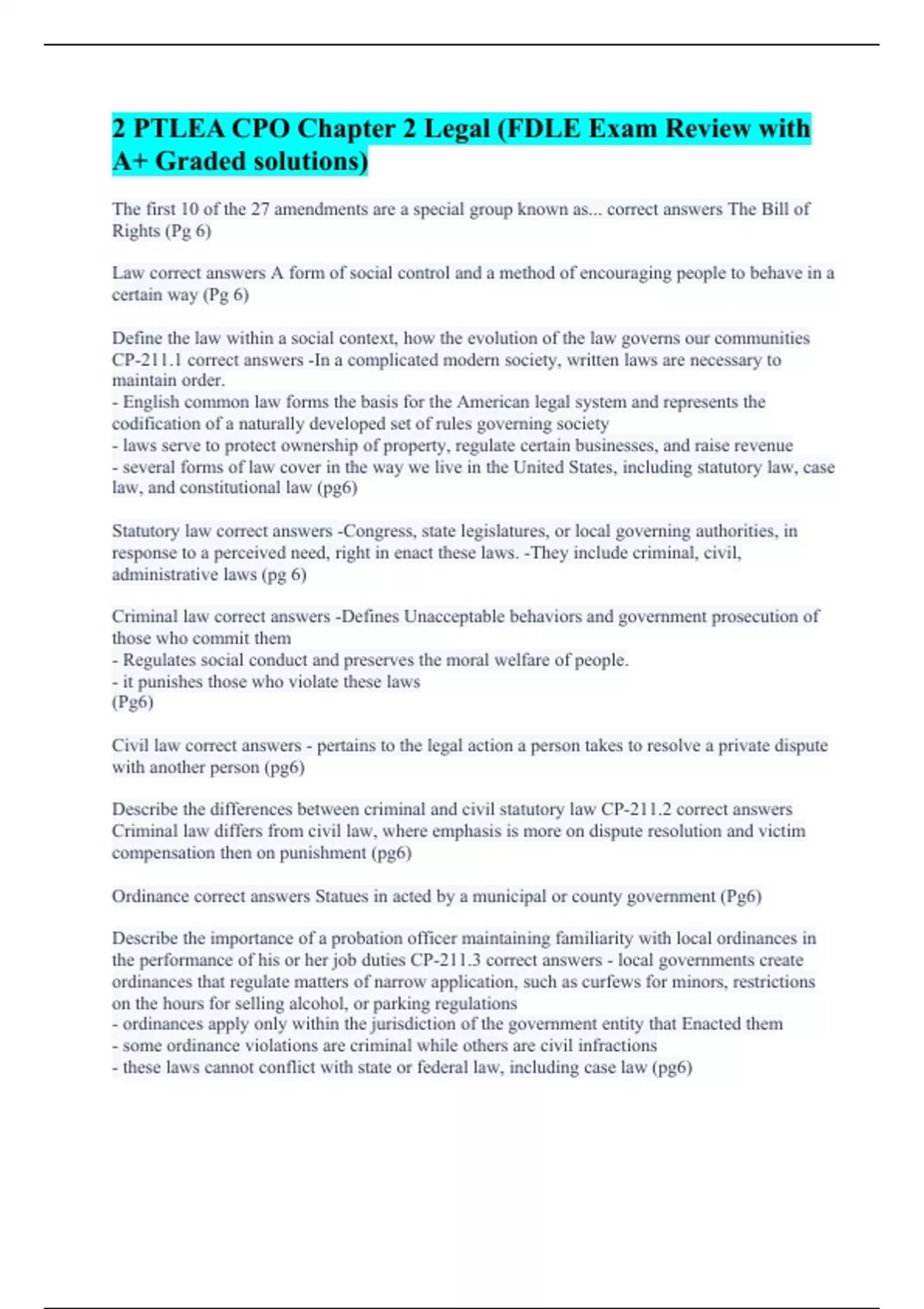 The first 10 of the 27 amendments are a special group known as... correct answers The Bill of Rights (Pg 6) Law correct answers A form of social control and a method of encouraging people to behave in a certain way (Pg 6) Define the law within a social context, how the evolution of the law governs our communities CP-211.1 correct answers -In a complicated modern society, written laws are necessary to maintain order. - English common law forms the basis for the American legal system and represents the codification of a naturally developed set of rules governing society - laws serve to protect ownership of property, regulate certain businesses, and raise revenue - several forms of law cover in the way we live in the United States, including statutory law, case law, and constitutional law (pg6) Statutory law correct answers -Congress, state legislatures, or local governing authorities, in response to a perceived need, right in enact these laws. -They include criminal, civil, administrative laws (pg 6) Criminal law correct answers -Defines Unacceptable behaviors and government prosecution of those who commit them - Regulates social conduct and preserves the moral welfare of people. - it punishes those who violate these laws (Pg6) Civil law correct answers - pertains to the legal action a person takes to resolve a private dispute with another person (pg6) Describe the differences between criminal and civil statutory law CP-211.2 correct answers Criminal law differs from civil law, where emphasis is more on dispute resolution and victim compensation then on punishment (pg6) Ordinance correct answers Statues in acted by a municipal or county government (Pg6) Describe the importance of a probation officer maintaining familiarity with local ordinances in the performance of his or her job duties CP-211.3 correct answers - local governments create ordinances that regulate matters of narrow application, such as curfews for minors, restrictions on the hours for selling alcohol, or parking regulations - ordinances apply only within the jurisdiction of the government entity that Enacted them - some ordinance violations are criminal while others are civil infractions - these laws cannot conflict with state or federal law, including case law (pg6)