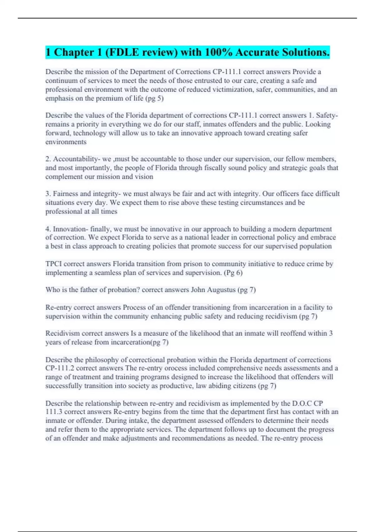 Describe the mission of the Department of Corrections CP-111.1 correct answers Provide a continuum of services to meet the needs of those entrusted to our care, creating a safe and professional environment with the outcome of reduced victimization, safer, communities, and an emphasis on the premium of life (pg 5) Describe the values of the Florida department of corrections CP-111.1 correct answers 1. Safety- remains a priority in everything we do for our staff, inmates offenders and the public. Looking forward, technology will allow us to take an innovative approach toward creating safer environments 2. Accountability- we ,must be accountable to those under our supervision, our fellow members, and most importantly, the people of Florida through fiscally sound policy and strategic goals that complement our mission and vision 3. Fairness and integrity- we must always be fair and act with integrity. Our officers face difficult situations every day. We expect them to rise above these testing circumstances and be professional at all times 4. Innovation- finally, we must be innovative in our approach to building a modern department of correction. We expect Florida to serve as a national leader in correctional policy and embrace a best in class approach to creating policies that promote success for our supervised population TPCI correct answers Florida transition from prison to community initiative to reduce crime by implementing a seamless plan of services and supervision. (Pg 6) Who is the father of probation? correct answers John Augustus (pg 7) Re-entry correct answers Process of an offender transitioning from incarceration in a facility to supervision within the community enhancing public safety and reducing recidivism (pg 7) Recidivism correct answers Is a measure of the likelihood that an inmate will reoffend within 3 years of release from incarceration(pg 7) Describe the philosophy of correctional probation within the Florida department of corrections CP-111.2 correct answers The re-entry orocess included comprehensive needs assessments and a range of treatment and training programs designed to increase the likelihood that offenders will successfully transition into society as productive, law abiding citizens (pg 7) Describe the relationship between re-entry and recidivism as implemented by the D.O.C CP 111.3 correct answers Re-entry begins from the time that the department first has contact with an inmate or offender. During intake, the department assessed offenders to determine their needs and refer them to the appropriate services. The department follows up to document the progress of an offender and make adjustments and recommendations as needed. The re-entry process