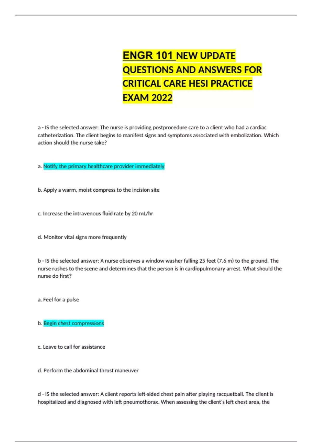 ENGR 101 NEW UPDATE QUESTIONS AND ANSWERS FOR CRITICAL CARE HESI PRACTICE EXAM 2022