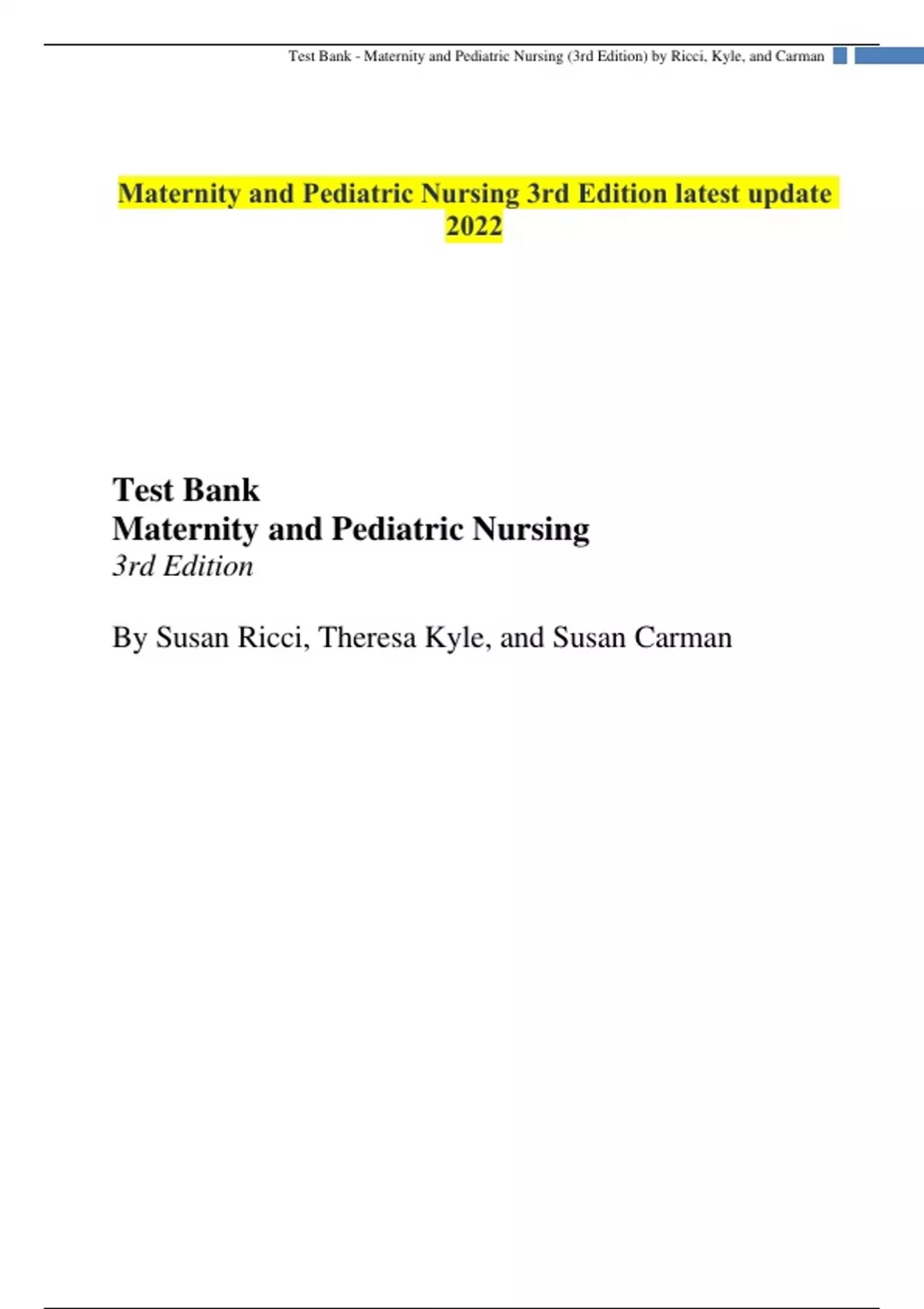 Maternity and Pediatric Nursing 3rd Edition latest update 2022 Test Bank Maternity and Pediatric Nursing 3rd Edition By Susan Ricci, Theresa Kyle, and Susan Carman Contents Chapter 1- Perspectives on Maternal, Newborn, and Women’s Health Care 4 Chapter 2- Family-Centered Community-Based Care 9 Chapter 3- Anatomy and Physiology of the Reproductive System 14 Chapter 4- Common Reproductive Issues 19 Chapter 5- Sexually Transmitted Infections 24 Chapter 6- Disorders of the Breasts 29 Chapter 7- Benign Disorders of the Female Reproductive Tract 34 Chapter 8- Cancers of the Female Reproductive Tract 39 Chapter 9- Violence and Abuse 44 Chapter 10- Fetal Development and Genetics 49 Chapter 11- Maternal Adaptation During Pregnancy 54 Chapter 12- Nursing Management During Pregnancy 60 Chapter 13- Labor and Birth Process 66 Chapter 14- Nursing Management During Labor and Birth 72 Chapter 15- Postpartum Adaptations 78 Chapter 16- Nursing Management During the Postpartum Period 84 Chapter 17- Newborn Transitioning 90 Chapter 18- Nursing Management of the Newborn 96 Chapter 19- Nursing Management of Pregnancy at Risk- Pregnancy 102 Chapter 20- Nursing Management of the Pregnancy at Risk 108 Chapter 21- Nursing Management of Labor and Birth at Risk 114 Chapter 22- Nursing Management of the Postpartum Woman at Risk 120 Chapter 23- Nursing Care of the Newborn With Special Needs 126 Chapter 24- Nursing Management of the Newborn at Risk 132 Chapter 25- Growth and Development of the Newborn and Infant 138 Chapter 26- Growth and Development of the Toddler 144 Chapter 27- Growth and Development of the Preschooler 150 Chapter 28- Growth and Development of the School-Age Child 157 Chapter 29- Growth and Development of the Adolescent 164 Chapter 30- Atraumatic Care of Children and Families 171 Chapter 31- Health Supervision 176 Chapter 32- Health Assessment of Children 183 Chapter 33- Caring for Children in Diverse Settings 190 Chapter 34- Caring for the Special Needs Child 197 Chapter 35- Key Pediatric Nursing Interventions 203 Chapter 36- Pain Management in Children 210 Chapter 37- Nursing Care of the Child With an Infectious or Communicable Disorder 217 Chapter 38- Nursing Care of the Child With an Alteration in Intracranial Regulation / Neurologic Disorder 224 Chapter 39- Nursing Care of the Child With an Alteration in Sensory Perception / Disorder of the Eyes or Ears 231 Chapter 40- Nursing Care of the Child With an Alteration in Gas Exchange / Respiratory Disorder 238 Chapter 41- Nursing Care of the Child With an Alteration in Perfusion / Cardiovascular Disorder 244 Chapter 42- Nursing Care of the Child With an Alteration in Bowel Elimination / Gastrointestinal Disorder 250 Chapter 43- Nursing Care of the Child With an Alteration in Urinary Elimination / Genitourinary Disorder 257 Chapter 44- Nursing Care of the Child With an Alteration in Mobility / Neuromuscular or Musculoskeletal Disorder ...................................................................................................................................................................................264 Extra Questions: Musculoskeletal Disorder 270 Chapter 45- Nursing Care of the Child With an Alteration in Tissue Integrity / Integumentary Disorder 277 Chapter 46- Nursing Care of the Child With an Alteration in Cellular Regulation / Hematologic or Neoplastic Disorder 283 Extra Questions: Neoplastic Disorder 290 Chapter 47- Nursing Care of the Child With an Alteration in Immunity or Immunologic Disorder 296 Chapter 48- Nursing Care of the Child With an Alteration in Metabolism / Endocrine Disorder 303 Chapter 49- Nursing Care of the Child With an Alteration in Genetics 310 Chapter 50- Nursing Care of the Child With an Alteration in Behavior, Cognition, or Development 317 Chapter 51- Nursing Care During a Pediatric Emergency 324 Chapter 1- Perspectives on Maternal, Newborn, and Women’s Health Care The United States ranks 50th in the world for maternal mortality and 41st among industrialized nations for infant mortality rate. When developing programs to assist in decreasing these rates, which factor would most likely need to be addressed as having the greatest impact? Resolving all language and cultural differences Assuring early and adequate prenatal care Providing more extensive women’s shelters Encouraging all women to eat a balanced diet When integrating the principles of family-centered care, the nurse would include which of the following? Childbirth is viewed as a procedural event Families are unable to make informed choices Childbirth results in changes in relationships Families require little information to make appropriate decisions When preparing a teaching plan for a group of first-time pregnant women, the nurse expects to review how maternity care has changed over the years. Which of the following would the nurse include when discussing events of the 20th century? Epidemics of puerperal fever Performance of the first cesarean birth Development of the x-ray to assess pelvic size Creation of free-standing birth centers After teaching a group of students about pregnancy-related mortality, the instructor determines that additional teaching is needed when the students identify which condition as a leading cause? Hemorrhage Embolism Obstructed labor Infection
