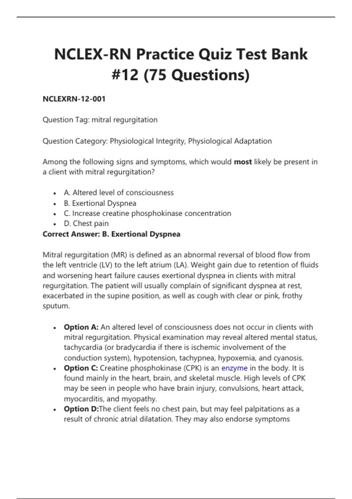 NCLEXRN-12-001 Question Tag: mitral regurgitation Question Category: Physiological Integrity, Physiological Adaptation Among the following signs and symptoms, which would most likely be present in a client with mitral regurgitation? A. Altered level of consciousness B. Exertional Dyspnea C. Increase creatine phosphokinase concentration D. Chest pain Correct Answer: B. Exertional Dyspne