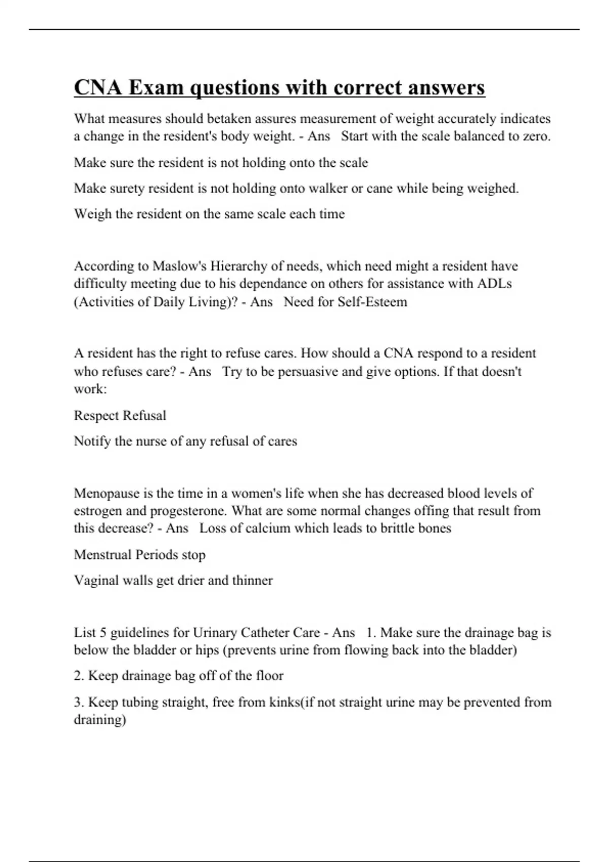 What measures should betaken assures measurement of weight accurately indicates a change in the resident's body weight. - Ans Start with the scale balanced to zero. Make sure the resident is not holding onto the scale Make surety resident is not holding onto walker or cane while being weighed. Weigh the resident on the same scale each time According to Maslow's Hierarchy of needs, which need might a resident have difficulty meeting due to his dependance on others for assistance with ADLs (Activities of Daily Living)? - Ans Need for Self-Esteem A resident has the right to refuse cares. How should a CNA respond to a resident who refuses care? - Ans Try to be persuasive and give options. If that doesn't work: Respect Refusal Notify the nurse of any refusal of cares Menopause is the time in a women's life when she has decreased blood levels of estrogen and progesterone. What are some normal changes offing that result from this decrease? - Ans Loss of calcium which leads to brittle bones Menstrual Periods stop Vaginal walls get drier and thinner List 5 guidelines for Urinary Catheter Care - Ans 1. Make sure the drainage bag is below the bladder or hips (prevents urine from flowing back into the bladder) 2. Keep drainage bag off of the floor 3. Keep tubing straight, free from kinks(if not straight urine may be prevented from draining)