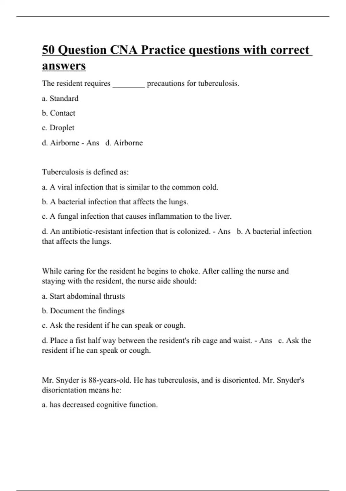 The resident requires ________ precautions for tuberculosis. a. Standard b. Contact c. Droplet d. Airborne - Ans d. Airborne Tuberculosis is defined as: a. A viral infection that is similar to the common cold. b. A bacterial infection that affects the lungs. c. A fungal infection that causes inflammation to the liver. d. An antibiotic-resistant infection that is colonized. - Ans b. A bacterial infection that affects the lungs. While caring for the resident he begins to choke. After calling the nurse and staying with the resident, the nurse aide should: a. Start abdominal thrusts b. Document the findings c. Ask the resident if he can speak or cough. d. Place a fist half way between the resident's rib cage and waist. - Ans c. Ask the resident if he can speak or cough. Mr. Snyder is 88-years-old. He has tuberculosis, and is disoriented. Mr. Snyder's disorientation means he: a. has decreased cognitive function.