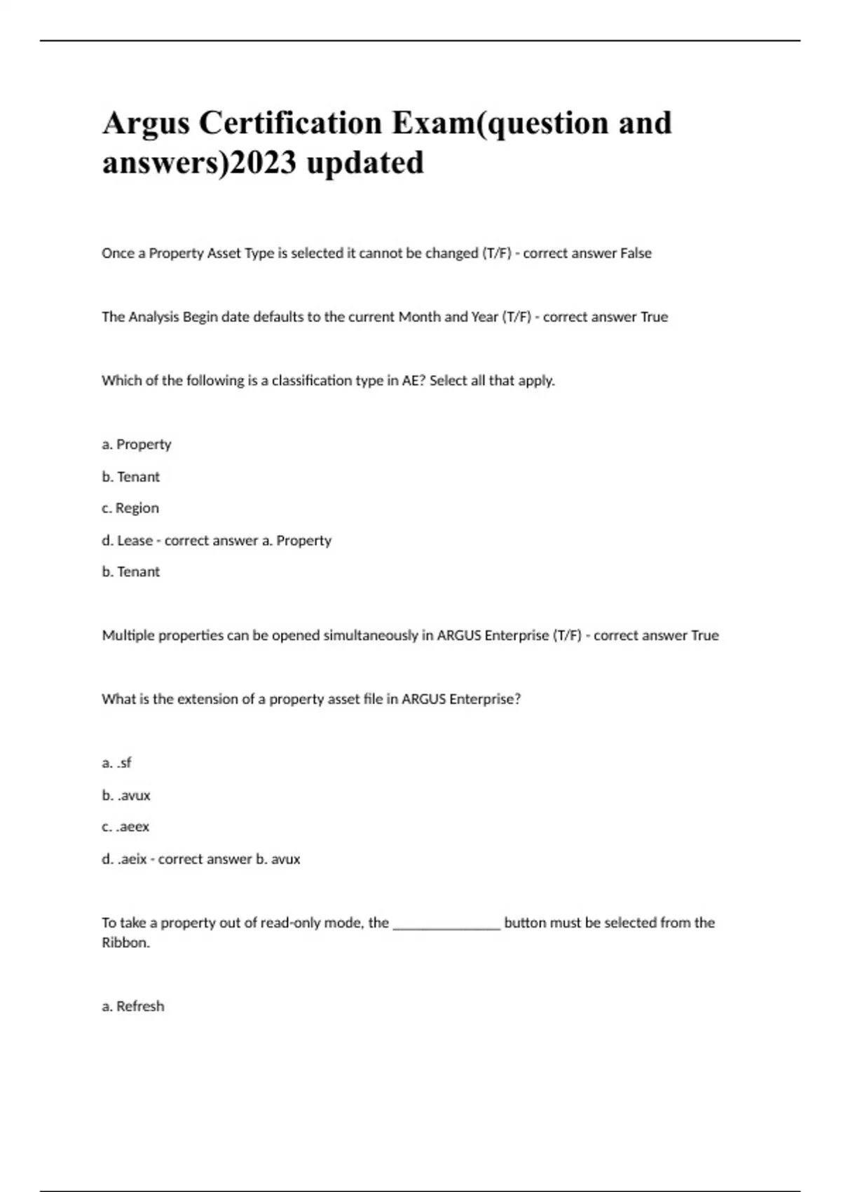 Argus Certification Exam(question and answers)2023 updatedOnce a Property Asset Type is selected it cannot be changed (T/F) - correct answer False The Analysis Begin date defaults to the current Month and Year (T/F) - correct answer True Which of the following is a classification type in AE? Select all that apply. a. Property b. Tenant c. Region d. Lease - correct answer a. Property b. Tenant Multiple properties can be opened simultaneously in ARGUS Enterprise (T/F) - correct answer True What is the extension of a property asset file in ARGUS Enterprise? a. .sf b. .avux c. .aeex d. .aeix - correct answer b. avux To take a property out of read-only mode, the ______________ button must be selected from the Ribbon. a. Refresh b. Ellipses c. Check In/Out Property d. Edit Property - correct answer d. Edit Property What should be selected as the 'How Input' method in order for the revenue or expense to be based on a percentage of other cash flow items in the property? a. Amount 1 b. Sub-lines c. % of Other d. Currency Amount / Vacant Area - correct answer c. % of Other To replicate a value in a specific month of each year during the project for a specific expense, you must click which button in the amount 1 Varies window? a. Copy Across & Down b. Copy to End c. Copy Column to End d. Column - correct answer c. Copy Column to End When calculating a Market Leasing profile with the Upon Expiration set to Renewal, Enterprise ________________________________________. a. Assumes a 0% renewal b. Takes a weighted average c. Assumes the space goes dark d. Assumes a 100% renewal - correct answer d. Assumes a 100% renewal The Upon Expiration field within the Market Leasing profile allows us to select any overrides for past terms (T/F) - correct answer False