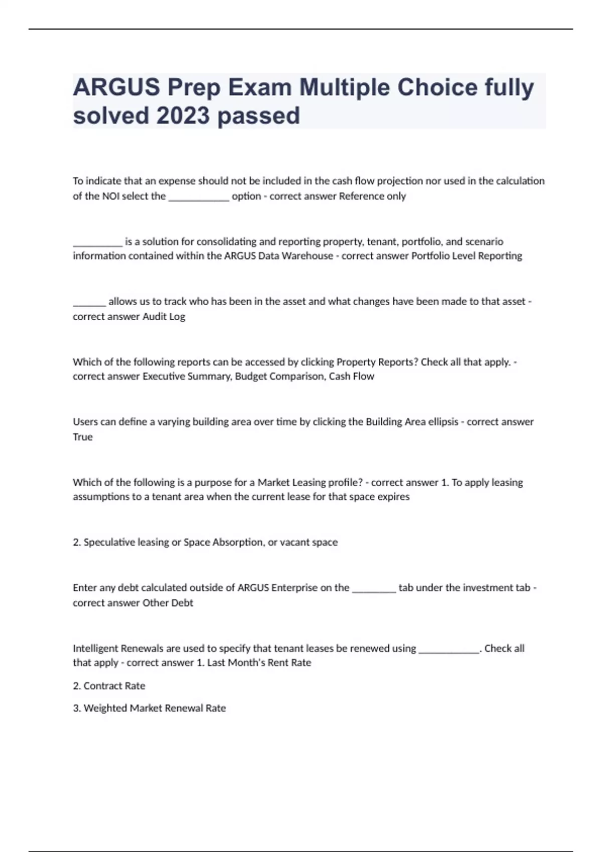 ARGUS Prep Exam Multiple Choice fully solved 2023 passedTo indicate that an expense should not be included in the cash flow projection nor used in the calculation of the NOI select the ___________ option - correct answer Reference only _________ is a solution for consolidating and reporting property, tenant, portfolio, and scenario information contained within the ARGUS Data Warehouse - correct answer Portfolio Level Reporting ______ allows us to track who has been in the asset and what changes have been made to that asset - correct answer Audit Log Which of the following reports can be accessed by clicking Property Reports? Check all that apply. - correct answer Executive Summary, Budget Comparison, Cash Flow Users can define a varying building area over time by clicking the Building Area ellipsis - correct answer True Which of the following is a purpose for a Market Leasing profile? - correct answer 1. To apply leasing assumptions to a tenant area when the current lease for that space expires 2. Speculative leasing or Space Absorption, or vacant space Enter any debt calculated outside of ARGUS Enterprise on the ________ tab under the investment tab - correct answer Other Debt Intelligent Renewals are used to specify that tenant leases be renewed using ___________. Check all that apply - correct answer 1. Last Month's Rent Rate 2. Contract Rate 3. Weighted Market Renewal Rate 4. Market Rent in a different Market Leasing profile