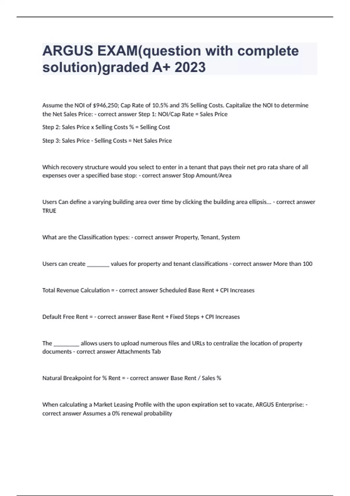 ARGUS EXAM(question with complete solution)graded A+ 2023Assume the NOI of $946,250; Cap Rate of 10.5% and 3% Selling Costs. Capitalize the NOI to determine the Net Sales Price: - correct answer Step 1: NOI/Cap Rate = Sales Price Step 2: Sales Price x Selling Costs % = Selling Cost Step 3: Sales Price - Selling Costs = Net Sales Price Which recovery structure would you select to enter in a tenant that pays their net pro rata share of all expenses over a specified base stop: - correct answer Stop Amount/Area Users Can define a varying building area over time by clicking the building area ellipsis... - correct answer TRUE What are the Classification types: - correct answer Property, Tenant, System Users can create _______ values for property and tenant classifications - correct answer More than 100 Total Revenue Calculation = - correct answer Scheduled Base Rent + CPI Increases Default Free Rent = - correct answer Base Rent + Fixed Steps + CPI Increases The ________ allows users to upload numerous files and URLs to centralize the location of property documents - correct answer Attachments Tab Natural Breakpoint for % Rent = - correct answer Base Rent / Sales % When calculating a Market Leasing Profile with the upon expiration set to vacate, ARGUS Enterprise: - correct answer Assumes a 0% renewal probability