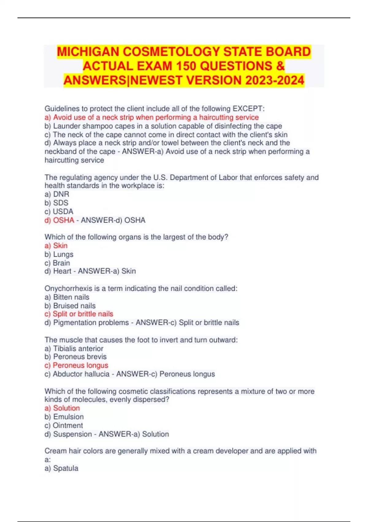 MICHIGAN COSMETOLOGY STATE BOARD ACTUAL EXAM 150 QUESTIONS & ANSWERS|NEWEST VERSION