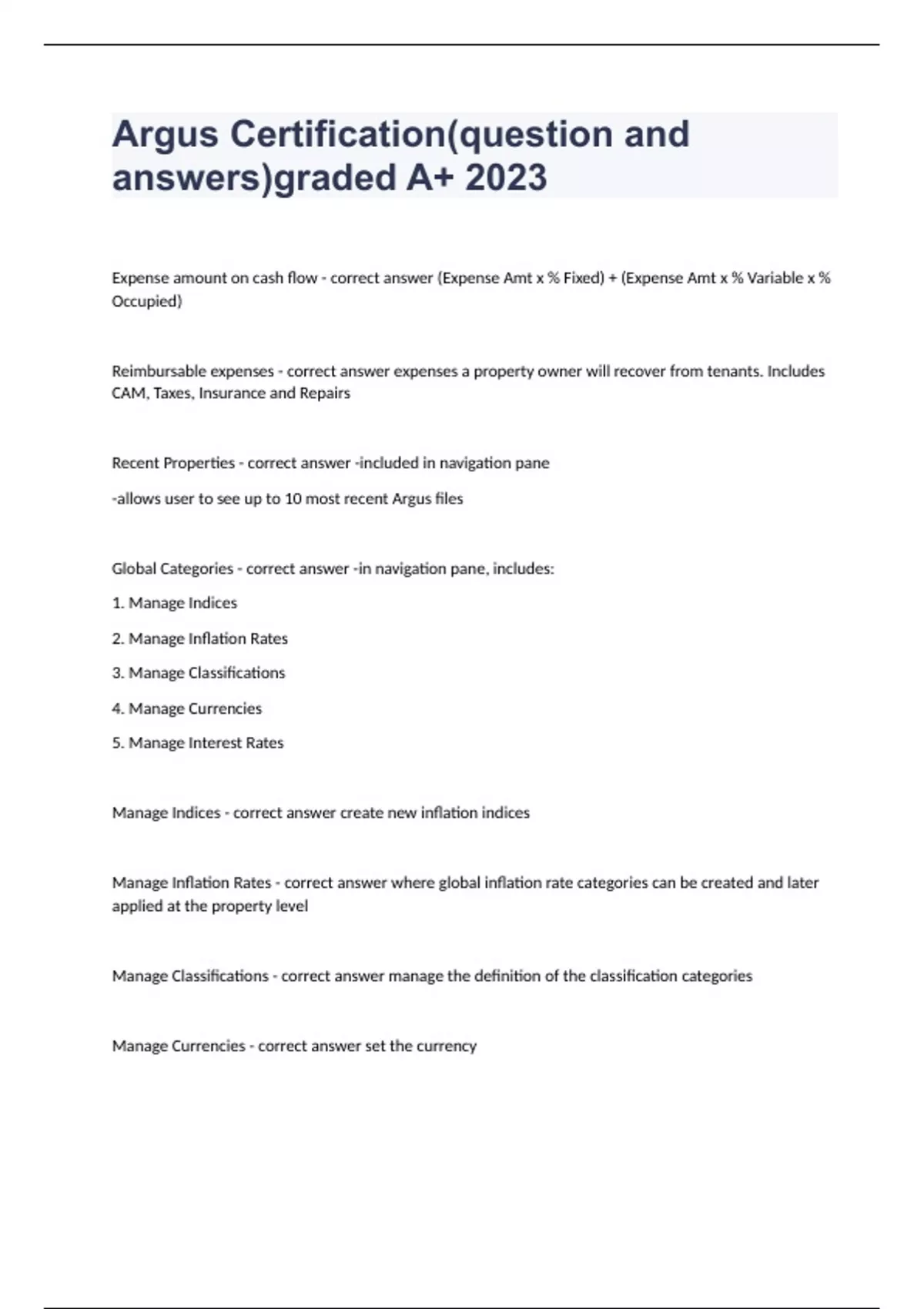 Argus Certification(question and answers)graded A+ 2023Expense amount on cash flow - correct answer (Expense Amt x % Fixed) + (Expense Amt x % Variable x % Occupied) Reimbursable expenses - correct answer expenses a property owner will recover from tenants. Includes CAM, Taxes, Insurance and Repairs Recent Properties - correct answer -included in navigation pane -allows user to see up to 10 most recent Argus files Global Categories - correct answer -in navigation pane, includes: 1. Manage Indices 2. Manage Inflation Rates 3. Manage Classifications 4. Manage Currencies 5. Manage Interest Rates Manage Indices - correct answer create new inflation indices Manage Inflation Rates - correct answer where global inflation rate categories can be created and later applied at the property level Manage Classifications - correct answer manage the definition of the classification categories Manage Currencies - correct answer set the currency