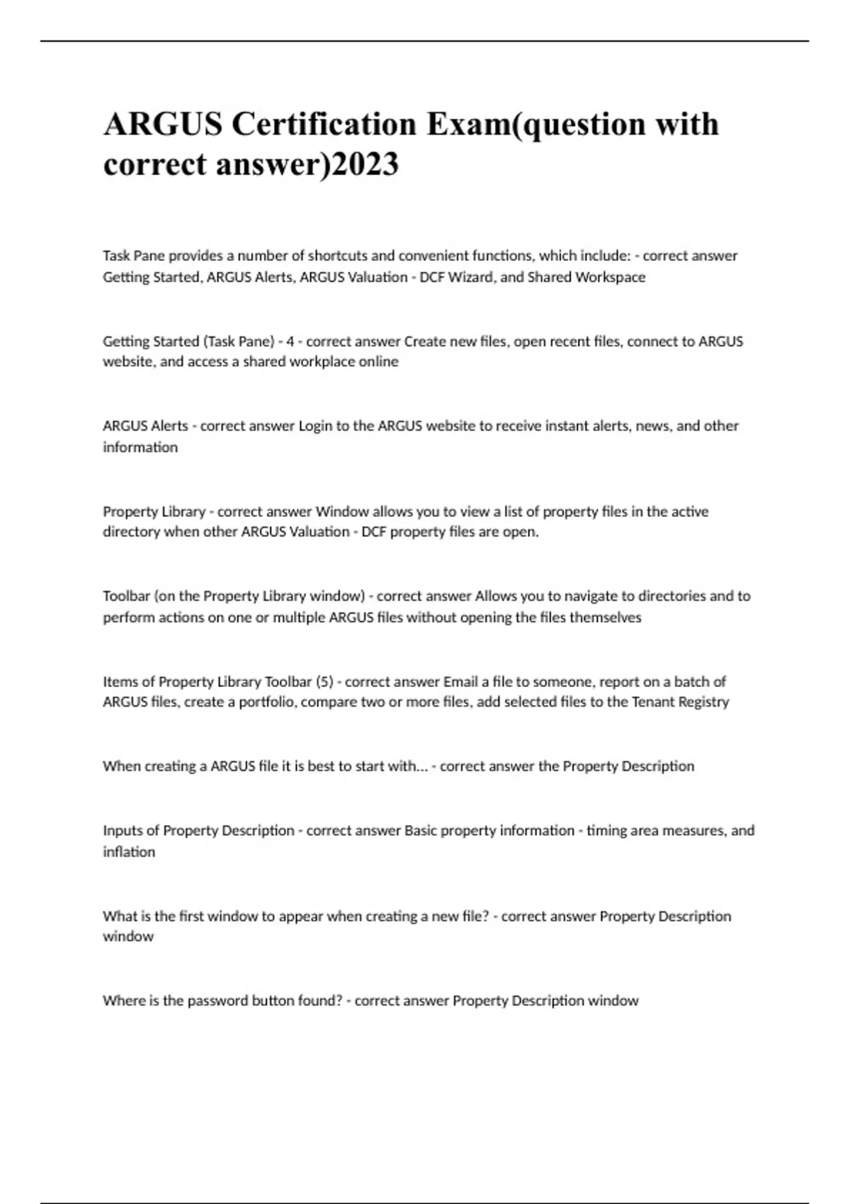 ARGUS Certification Exam(question with correct answer)2023Task Pane provides a number of shortcuts and convenient functions, which include: - correct answer Getting Started, ARGUS Alerts, ARGUS Valuation - DCF Wizard, and Shared Workspace Getting Started (Task Pane) - 4 - correct answer Create new files, open recent files, connect to ARGUS website, and access a shared workplace online ARGUS Alerts - correct answer Login to the ARGUS website to receive instant alerts, news, and other information Property Library - correct answer Window allows you to view a list of property files in the active directory when other ARGUS Valuation - DCF property files are open. Toolbar (on the Property Library window) - correct answer Allows you to navigate to directories and to perform actions on one or multiple ARGUS files without opening the files themselves Items of Property Library Toolbar (5) - correct answer Email a file to someone, report on a batch of ARGUS files, create a portfolio, compare two or more files, add selected files to the Tenant Registry When creating a ARGUS file it is best to start with... - correct answer the Property Description Inputs of Property Description - correct answer Basic property information - timing area measures, and inflation What is the first window to appear when creating a new file? - correct answer Property Description window Where is the password button found? - correct answer Property Description window