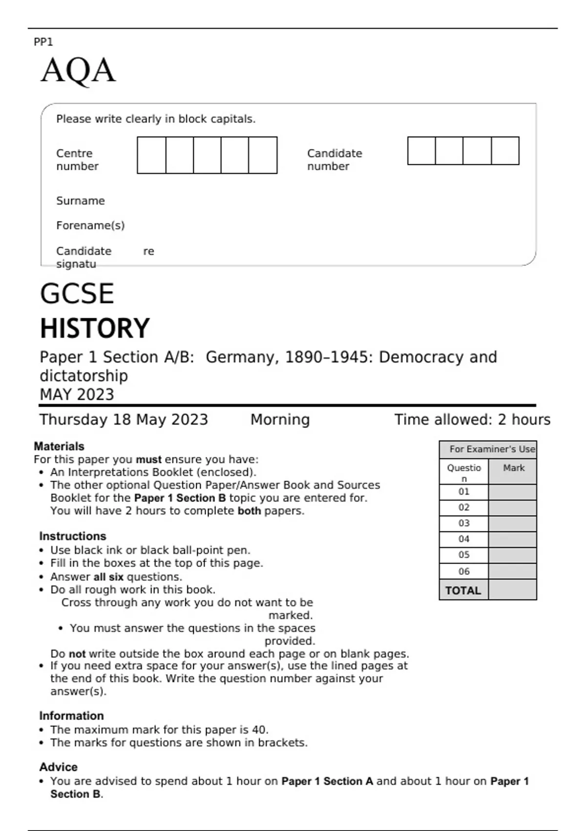 AQA GCSE HISTORY Paper 1 MAY 2023 FINAL QUESTION PAPER Section A/B: Germany, 1890–1945: Democracy and dictatorship