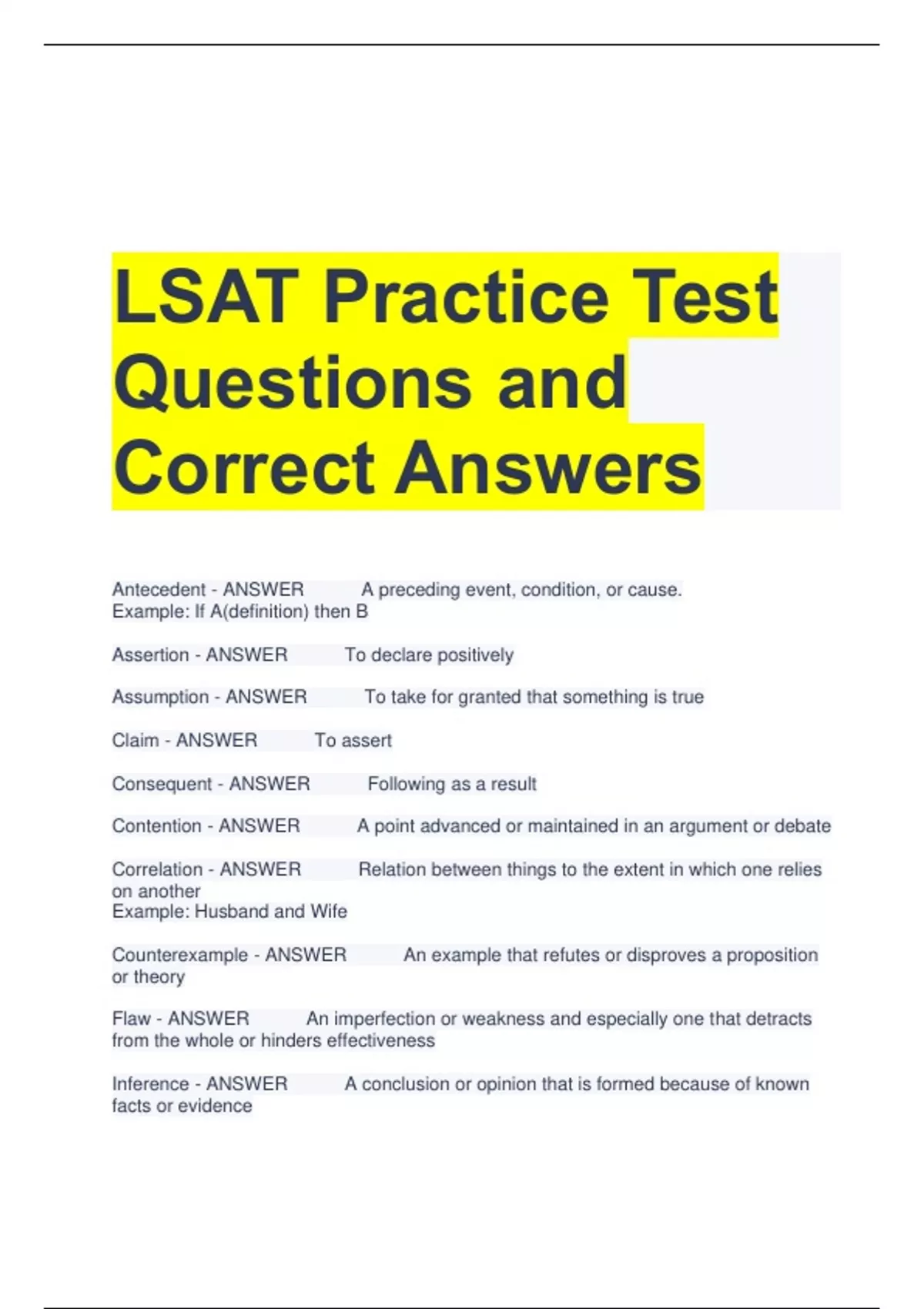 LSAT Practice Test Questions and Correct Answers Antecedent - ANSWER A preceding event, condition, or cause. Example: If A(definition) then B Assertion - ANSWER To declare positively Assumption - ANSWER To take for granted that something is true Claim - ANSWER To assert Consequent - ANSWER Following as a result Contention - ANSWER A point advanced or maintained in an argument or debate Correlation - ANSWER Relation between things to the extent in which one relies on another Example: Husband and Wife Counterexample - ANSWER An example that refutes or disproves a proposition or theory Flaw - ANSWER An imperfection or weakness and especially one that detracts from the whole or hinders effectiveness Inference - ANSWER A conclusion or opinion that is formed because of known facts or evidence Necessary - ANSWER Logically unavoidable; needed Paradox - ANSWER A statement that is seemingly contradictory or opposed to common sense and yet is perhaps true Premise - ANSWER A proposition antecedently supposed or proved as a basis of an argument or inference Principle - ANSWER A comprehensive and fundamental law, doctrine, or assumption Proposition - ANSWER Something offered for consideration or acceptance Rebuttal - ANSWER To contradict or oppose by formal legal argument, plea, or countervailing proof; beat back