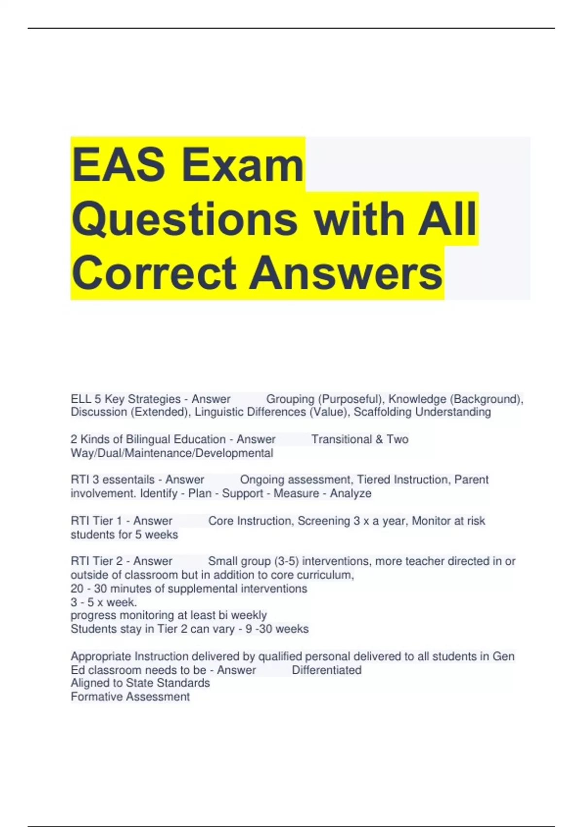 EAS Exam Questions with All Correct Answers ELL 5 Key Strategies - Answer Grouping (Purposeful), Knowledge (Background), Discussion (Extended), Linguistic Differences (Value), Scaffolding Understanding 2 Kinds of Bilingual Education - Answer Transitional & Two Way/Dual/Maintenance/Developmental RTI 3 essentails - Answer Ongoing assessment, Tiered Instruction, Parent involvement. Identify - Plan - Support - Measure - Analyze RTI Tier 1 - Answer Core Instruction, Screening 3 x a year, Monitor at risk students for 5 weeks RTI Tier 2 - Answer Small group (3-5) interventions, more teacher directed in or outside of classroom but in addition to core curriculum, 20 - 30 minutes of supplemental interventions 3 - 5 x week. progress monitoring at least bi weekly Students stay in Tier 2 can vary - 9 -30 weeks Appropriate Instruction delivered by qualified personal delivered to all students in Gen Ed classroom needs to be - Answer Differentiated Aligned to State Standards Formative Assessment High Quality research based RTI Tier 3 - Answer Indiviudual Students (1 - 2) More Frequent: 30 - 60 mins at least 4 days per week Monitor Progress at least 1 x week Duration: minimum 15 - 20 weeks
