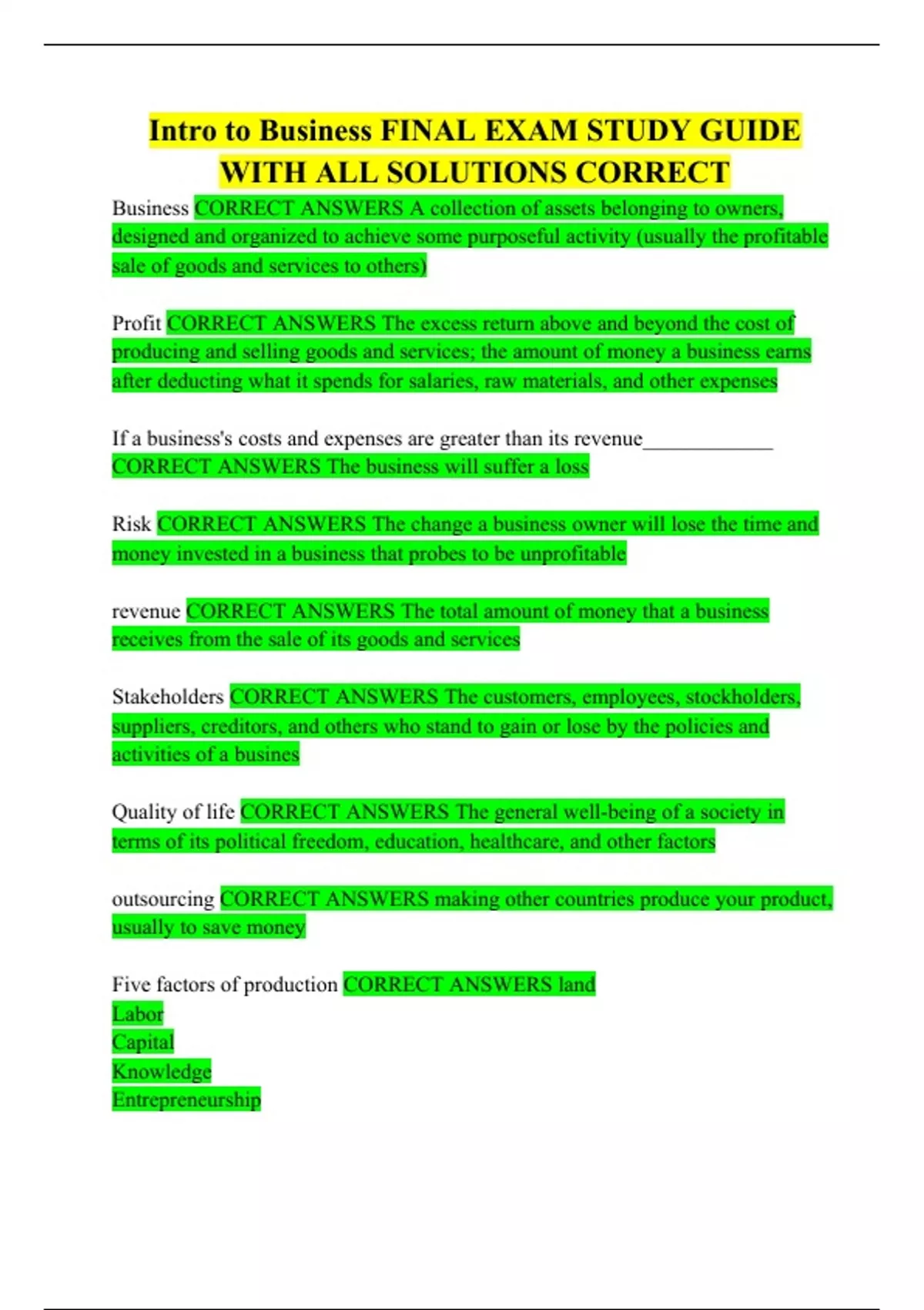 Intro to Business FINAL EXAM STUDY GUIDE WITH ALL SOLUTIONS CORRECT