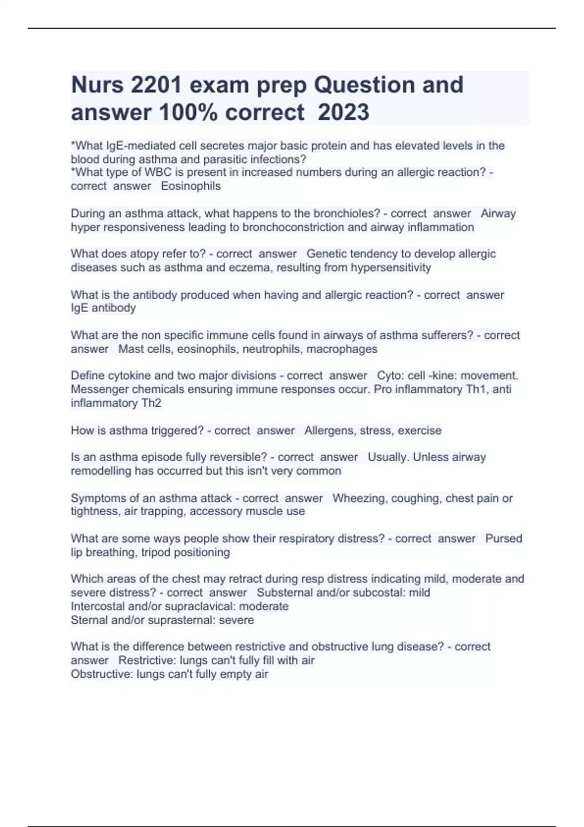 Nurs 2201 exam prep Question and answer 100% correct 2023 *What IgE-mediated cell secretes major basic protein and has elevated levels in the blood during asthma and parasitic infections? *What type of WBC is present in increased numbers during an allergic reaction? - correct answer Eosinophils During an asthma attack, what happens to the bronchioles? - correct answer Airway hyper responsiveness leading to bronchoconstriction and airway inflammation What does atopy refer to? - correct answer Genetic tendency to develop allergic diseases such as asthma and eczema, resulting from hypersensitivity What is the antibody produced when having and allergic reaction? - correct answer IgE antibody What are the non specific immune cells found in airways of asthma sufferers? - correct answer Mast cells, eosinophils, neutrophils, macrophages Define cytokine and two major divisions - correct answer Cyto: cell -kine: movement. Messenger chemicals ensuring immune responses occur. Pro inflammatory Th1, anti inflammatory Th2