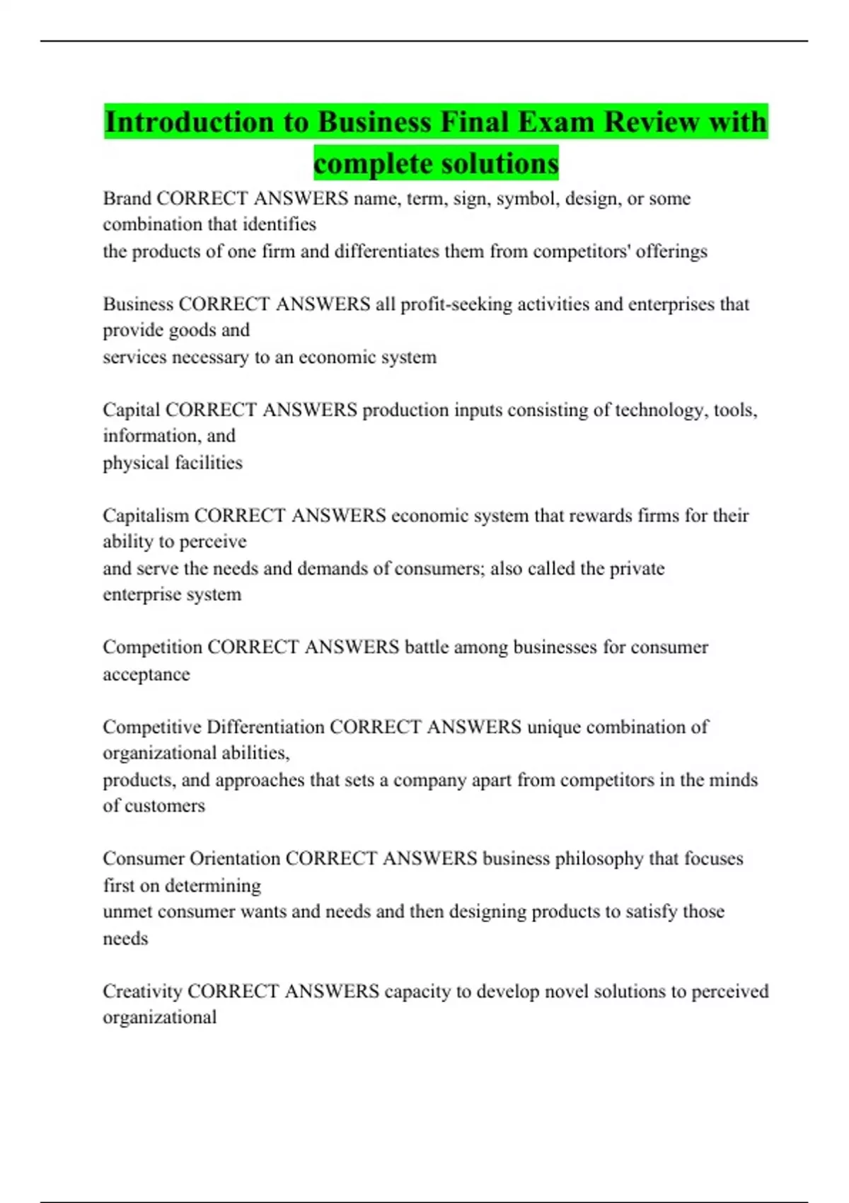 Introduction to Business Final Exam Review with complete solutions