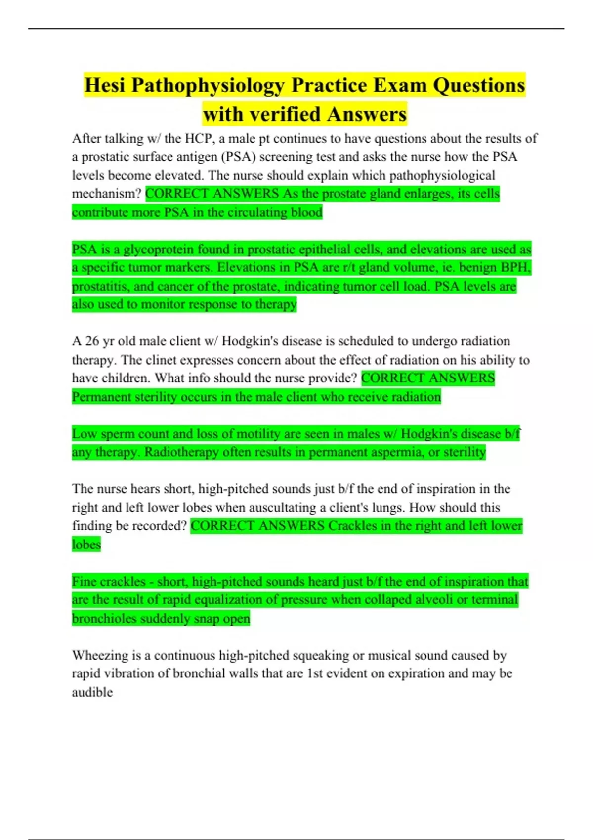 Hesi Pathophysiology Practice Exam Questions with verified Answers After talking w/ the HCP, a male pt continues to have questions about the results of a prostatic surface antigen (PSA) screening test and asks the nurse how the PSA levels become elevated. The nurse should explain which pathophysiological mechanism? A 26 yr old male client w/ Hodgkin's disease is scheduled to undergo radiation therapy. The clinet expresses concern about the effect of radiation on his ability to have children. What info should the nurse provide? The nurse hears short, high-pitched sounds just b/f the end of inspiration in the right and left lower lobes when auscultating a client's lungs. How should this finding be recorded? Wheezing is a continuous high-pitched squeaking or musical sound caused by rapid vibration of bronchial walls that are 1st evident on expiration and may be audible A client is admitted to the ER w/ a tension pneumothorax. Which assessment should the nurse expect to ID? A client who is receiving a whole blood transfusion dv's chills, fever, and a HA 30 min after the transfusion is started. The nurse shold recognize these sx as characteristic of what rxn?
