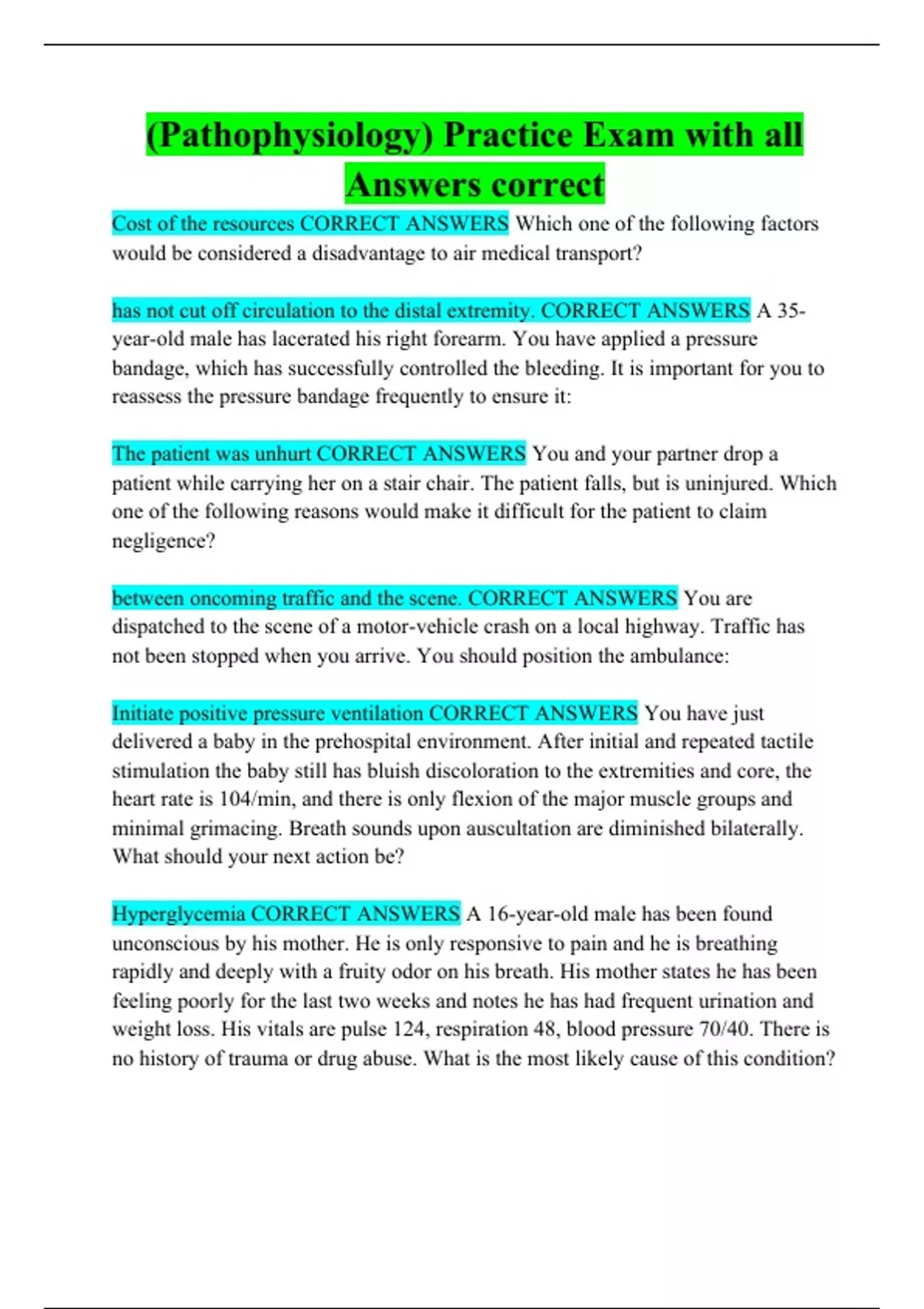 Pathophysiology) Practice Exam with all Answers correct Which one of the following factors would be considered a disadvantage to air medical transport? A 35-year-old male has lacerated his right forearm. You have applied a pressure bandage, which has successfully controlled the bleeding. It is important for you to reassess the pressure bandage frequently to ensure it: You and your partner drop a patient while carrying her on a stair chair. The patient falls, but is uninjured. Which one of the following reasons would make it difficult for the patient to claim negligence? You are dispatched to the scene of a motor-vehicle crash on a local highway. Traffic has not been stopped when you arrive. You should position the ambulance: You have just delivered a baby in the prehospital environment. After initial and repeated tactile stimulation the baby still has bluish discoloration to the extremities and core, the heart rate is 104/min, and there is only flexion of the major muscle groups and minimal grimacing. Breath sounds upon auscultation are diminished bilaterally. What should your next action be? A 16-year-old male has been found unconscious by his mother. He is only responsive to pain and he is breathing rapidly and deeply with a fruity odor on his breath. His mother states he has been feeling poorly for the last two weeks and notes he has had frequent urination and weight loss. His vitals are pulse 124, respiration 48, blood pressure 70/40. There is no history of trauma or drug abuse. What is the most likely cause of this condition? You are responding to a federal penitentiary for an inmate riot. There is a multi-departmental response between police, fire, and EMS. While enroute to the facility on the red, you have a police escort in front of you to "clear the way". Why is this type of escort a dangerous situation?