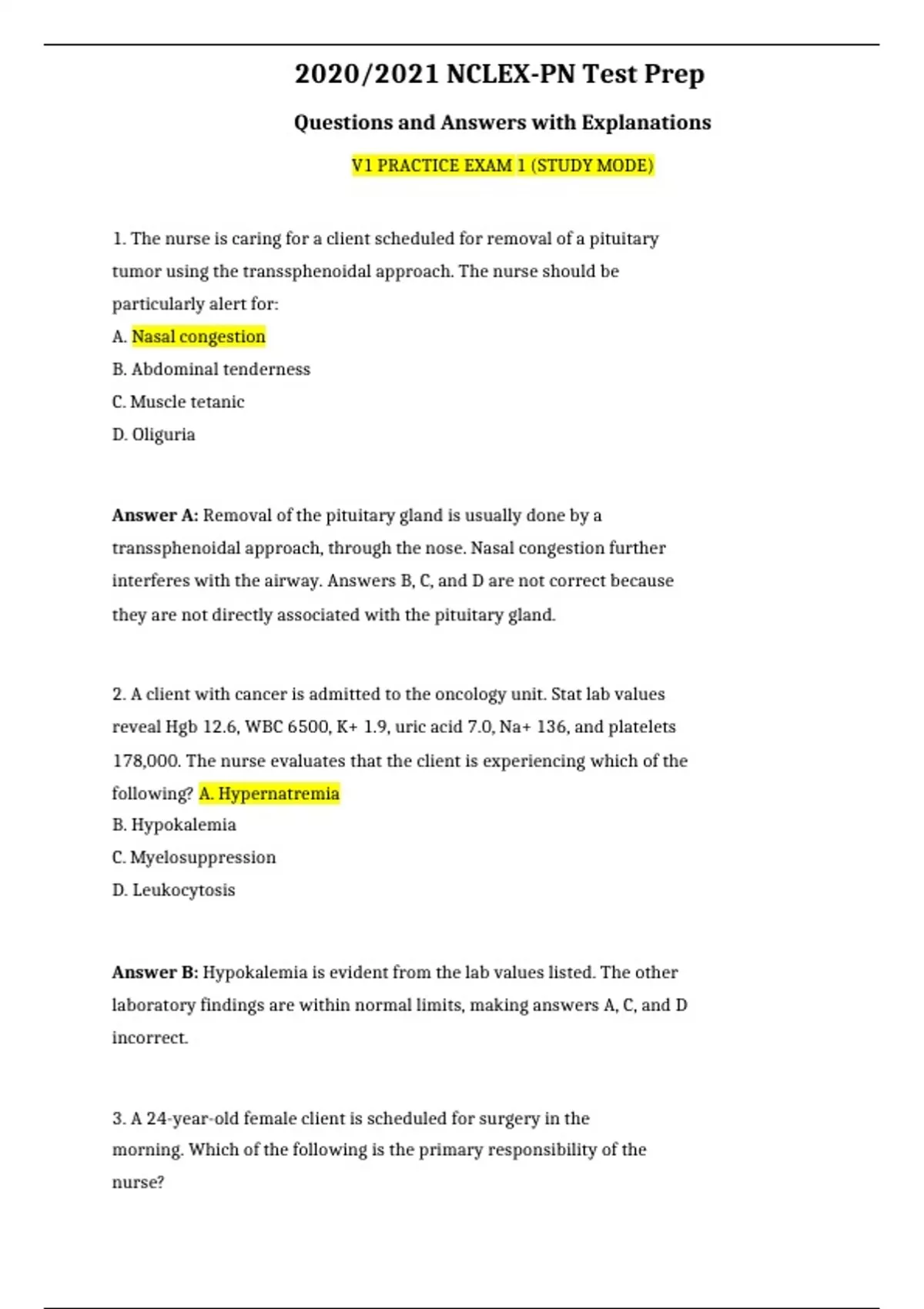 Questions and Answers with Explanations V1 PRACTICE EXAM 1 (STUDY MODE) 1. The nurse is caring for a client scheduled for removal of a pituitary tumor using the transsphenoidal approach. The nurse should be particularly alert for: A. Nasal congestion B. Abdominal tenderness C. Muscle tetanic D. Oliguria Answer A: Removal of the pituitary gland is usually done by a transsphenoidal approach, through the nose. Nasal congestion further interferes with the airway. Answers B, C, and D are not correct because they are not directly associated with the pituitary gland. 2. A client with cancer is admitted to the oncology unit. Stat lab values reveal Hgb 12.6, WBC 6500, K+ 1.9, uric acid 7.0, Na+ 136, and platelets 178,000. The nurse evaluates that the client is experiencing which of the following? A. Hypernatremia B. Hypokalemia C. Myelosuppression D. Leukocytosis Answer B: Hypokalemia is evident from the lab values listed. The other laboratory findings are within normal limits, making answers A, C, and D incorrect. 3. A 24-year-old female client is scheduled for surgery in the morning. Which of the following is the primary responsibility of the nurse? A. Taking the vital signs B. Obtaining the permit C. Explaining the procedure D. Checking the lab work Answer A: The primary responsibility of the nurse is to take the vital signs before any surgery. The actions in answers B, C, and D are the responsibility of the doctor and, therefore, are incorrect for this question. 4. The nurse is working in the emergency room when a client arrives with severe burns of the left arm, hands, face, and neck. Which action should receive priority? A. Starting an IV B. Applying oxygen C. Obtaining blood gases D. Medicating the client for pain Answer B: The client with burns to the neck needs airway assessment and supplemental oxygen, so applying oxygen is the priority. The next action should be to start an IV and medicate for pain, making answers A and C incorrect. Answer D, obtaining blood gases, is ordered by the doctor.