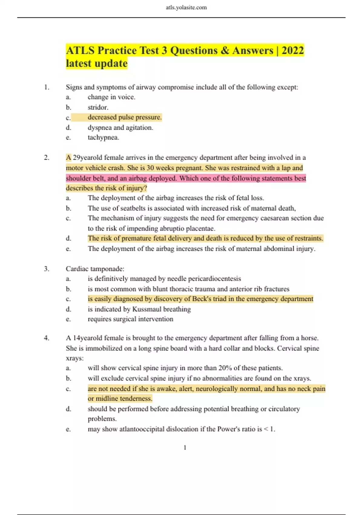 ATLS Practice Test 3 Questions & Answers | 2022 latest update 1. Signs and symptoms of airway compromise include all of the following except: a. change in voice. b. stridor. c. d. dyspnea and agitation. e. tachypnea. 2. A 29yearold female arrives in the emergency department after being involved in a motor vehicle crash. She is 30 weeks pregnant. She was restrained with a lap and shoulder belt, and an airbag deployed. Which one of the following statements best describes the risk of injury? a. The deployment of the airbag increases the risk of fetal loss. b. The use of seatbelts is associated with increased risk of maternal death, c. The mechanism of injury suggests the need for emergency caesarean section due to the risk of impending abruptio placentae. d. The risk of premature fetal delivery and death is reduced by the use of restraints. e. The deployment of the airbag increases the risk of maternal abdominal injury. 3. Cardiac tamponade: a. is definitively managed by needle pericardiocentesis b. is most common with blunt thoracic trauma and anterior rib fractures c. is easily diagnosed by discovery of Beck's triad in the emergency department d. is indicated by Kussmaul breathing e. requires surgical intervention 4. A 14yearold female is brought to the emergency department after falling from a horse. She is immobilized on a long spine board with a hard collar and blocks. Cervical spine xrays: a. will show cervical spine injury in more than 20% of these patients. b. will exclude cervical spine injury if no abnormalities are found on the xrays. c. are not needed if she is awake, alert, neurologically normal, and has no neck pain or midline tenderness. d. should be performed before addressing potential breathing or circulatory problems. e. may show atlantooccipital dislocation if the Power's ratio is 1.
