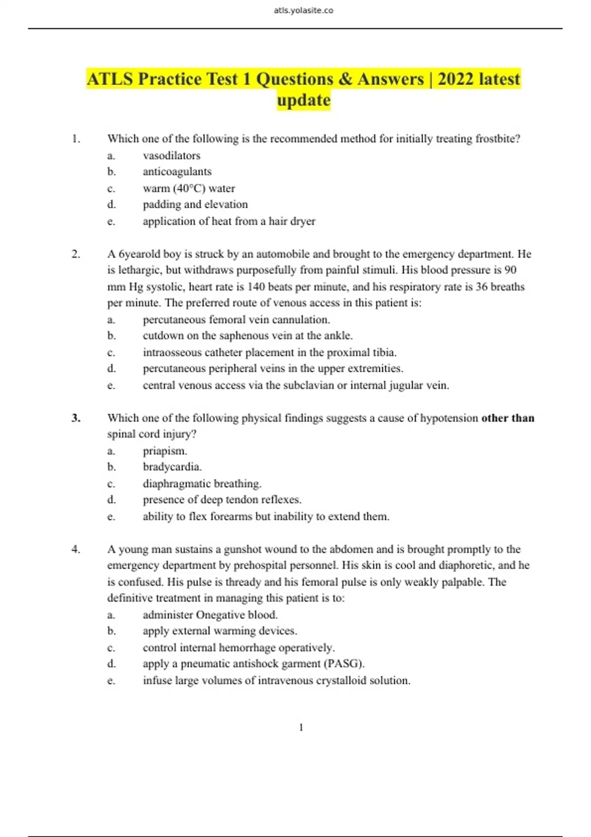 ATLS Practice Test 1 Questions & Answers | 2022 latest update 1. Which one of the following is the recommended method for initially treating frostbite? a. vasodilators b. anticoagulants c. warm (40°C) water d. padding and elevation e. application of heat from a hair dryer 2. A 6yearold boy is struck by an automobile and brought to the emergency department. He is lethargic, but withdraws purposefully from painful stimuli. His blood pressure is 90 mm Hg systolic, heart rate is 140 beats per minute, and his respiratory rate is 36 breaths per minute. The preferred route of venous access in this patient is: a. percutaneous femoral vein cannulation. b. cutdown on the saphenous vein at the ankle. c. intraosseous catheter placement in the proximal tibia. d. percutaneous peripheral veins in the upper extremities. e. central venous access via the subclavian or internal jugular vein. 3. Which one of the following physical findings suggests a cause of hypotension other than spinal cord injury? a. priapism. b. bradycardia. c. diaphragmatic breathing. d. presence of deep tendon reflexes. e. ability to flex forearms but inability to extend them. 4. A young man sustains a gunshot wound to the abdomen and is brought promptly to the emergency department by prehospital personnel. His skin is cool and diaphoretic, and he is confused. His pulse is thready and his femoral pulse is only weakly palpable. The definitive treatment in managing this patient is to: a. administer Onegative blood. b. apply external warming devices. c. control internal hemorrhage operatively. d. apply a pneumatic antishock garment (PASG). e. infuse large volumes of intravenous crystalloid solution.