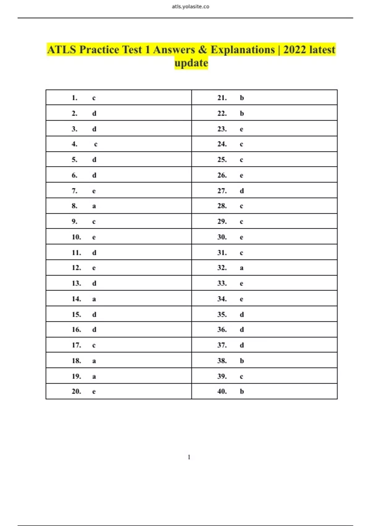 ATLS Practice Test 1 Answers & Explanations | 2022 latest update 1. c 21. b 2. d 22. b 3. d 23. e 4. c 24. c 5. d 25. c 6. d 26. e 7. e 27. d 8. a 28. c 9. c 29. c 10. e 30. e 11. d 31. c 12. e 32. a 13. d 33. e 14. a 34. e 15. d 35. d 16. d 36. d 17. c 37. d 18. a 38. b 19. a 39. c 20. e 40. b c. Treatment of frostbite should be immediate to decrease the duration of tissue freezing, although rewarming should not be undertaken if there is the risk of refreezing. The injured part should be placed in circulating water at a constant 40°C (104°F) until pink color and perfusion return (usually within 20 to 30 minutes). This is best accomplished in a large tank, such as a whirlpool tank. Avoid dry heat since this risks burning the skin, and do not rub or massage the area since this causes more tissue injury. Rewarming can be extremely painful, and adequate analgesia is essential. Cardiac monitoring during rewarming is advised. d. Short, largecaliber peripheral intravenous lines are preferred for the rapid infusion of large volumes of fluid. d. A spinal cord injury would generally cause absent reflexes at the level of the injury, hyperreflexia inferior to it, and normal reflexes superior to it. c. Most injured patients who are in hypovolemic shock require early surgical intervention or angioembolization, as well as fluid resuscitation. d. The absolute volume of blood loss required to produce shock is less than in adults. However, the percentage volume of blood loss required to produce shock is more than in adults. Note: Up to a 30% diminution in circulating blood volume may be required to cause a decrease in the child’s systolic blood pressure. Tachycardia and poor skin perfusion often are the only keys to early recognition of hypovolemia. d. In this scenario, airway and breathing have been addressed. The next priority is circulation. The patient is in hypovolemic shock. He is receiving IV fluids. Sources of hemorrhage must be sought. Thus, a FAST scan or DPL should be performed quickly. Almost simultaneously, a pelvic binder should be applied and pressure applied to external hemorrhage sites; but, these are not provided as answer choices. The other answer choices are not the next priorities, and would delay resuscitation. e. There is a high probability of a tension pneumothorax. Associated signs would be absent breath sounds, hyperresonance, JVD, hypotension, and tracheal deviation. Needle thoracentesis should be done immediately. There is not enough time to obtain a chest xray. a. The patient is in hypovolemic shock from a gunshot wound in the abdomen. Further diagnostic tests at this time would only delay the necessary surgical intervention, which is needed immediately. c. Transfer should be considered whenever the patient’s treatment needs exceed the capabilities of the institution. This decision requires an assessment of the patient’s injuries by the physician. e. Of the choices, only bilateral compartment syndrome in the legs is consistent with the mechanism and presentation of this case. Paralysis of the affected muscles is a late sign of compartment syndrome. Note: Central cord syndrome is characterized by a disproportionately greater loss of motor strength in the arms than in the legs. Usually this syndrome occurs after a cervical spine hyperextension injury in a patient with preexisting cervical canal stenosis.