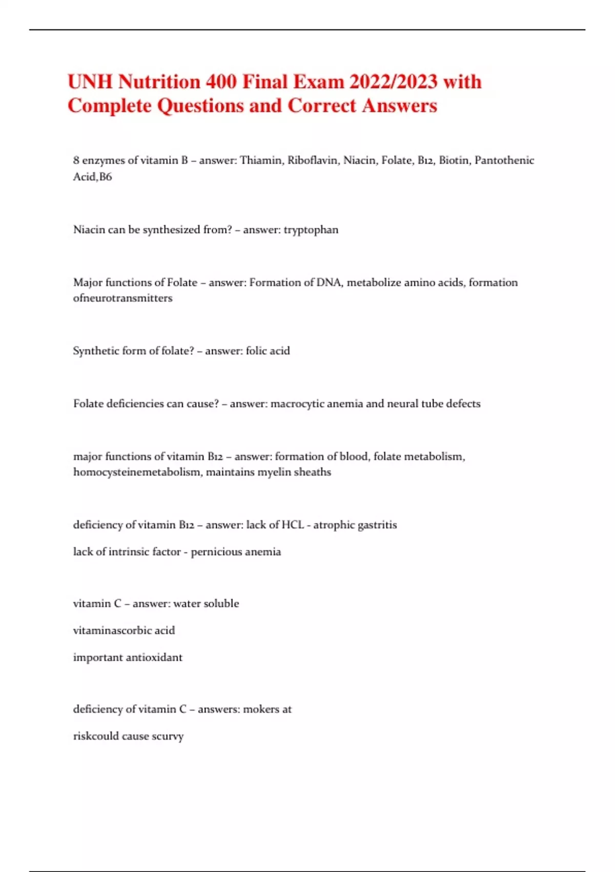 UNH Nutrition 400 Final Exam 2022/2023 with Complete Questions and Correct Answers 8 enzymes of vitamin B – answer: Thiamin, Riboflavin, Niacin, Folate, B12, Biotin, Pantothenic Acid, B6 Niacin can be synthesized from? – answer: tryptophan Major functions of Folate – answer: Formation of DNA, metabolize amino acids, formation of neurotransmitters Synthetic form of folate? – answer: folic acid Folate deficiencies can cause? – answer: macrocytic anemia and neural tube defects major functions of vitamin B12 – answer: formation of blood, folate metabolism, homocysteine metabolism, maintains myelin sheaths deficiency of vitamin B12 – answer: lack of HCL - atrophic gastritis lack of intrinsic factor - pernicious anemia vitamin C – answer: water soluble vitamin ascorbic acid important antioxidant deficiency of vitamin C – answers: mokers at risk could cause scurvy toxicity – answer: GI disturbances what can Vitamin C protect against – answer: cancer, heart disease, common cold symptoms of beriberi – answer: edema, extreme fatigue innate immunity – answer: nonspecific, present at birth, physical barriers, HCL, fever acquired immunity – answer: adaptive or specific, develops as we age, production of antibodies oxidizing agents – answer: cause cell damage, free radicals (unpaired electron, unstable), initiate cascade of disturbance antioxidants – answer: able to stop or repair free radical damage, largely supplied by diet vitamin E – answer: fat soluble vitamin, important antioxidant in lipid-rich areas of body