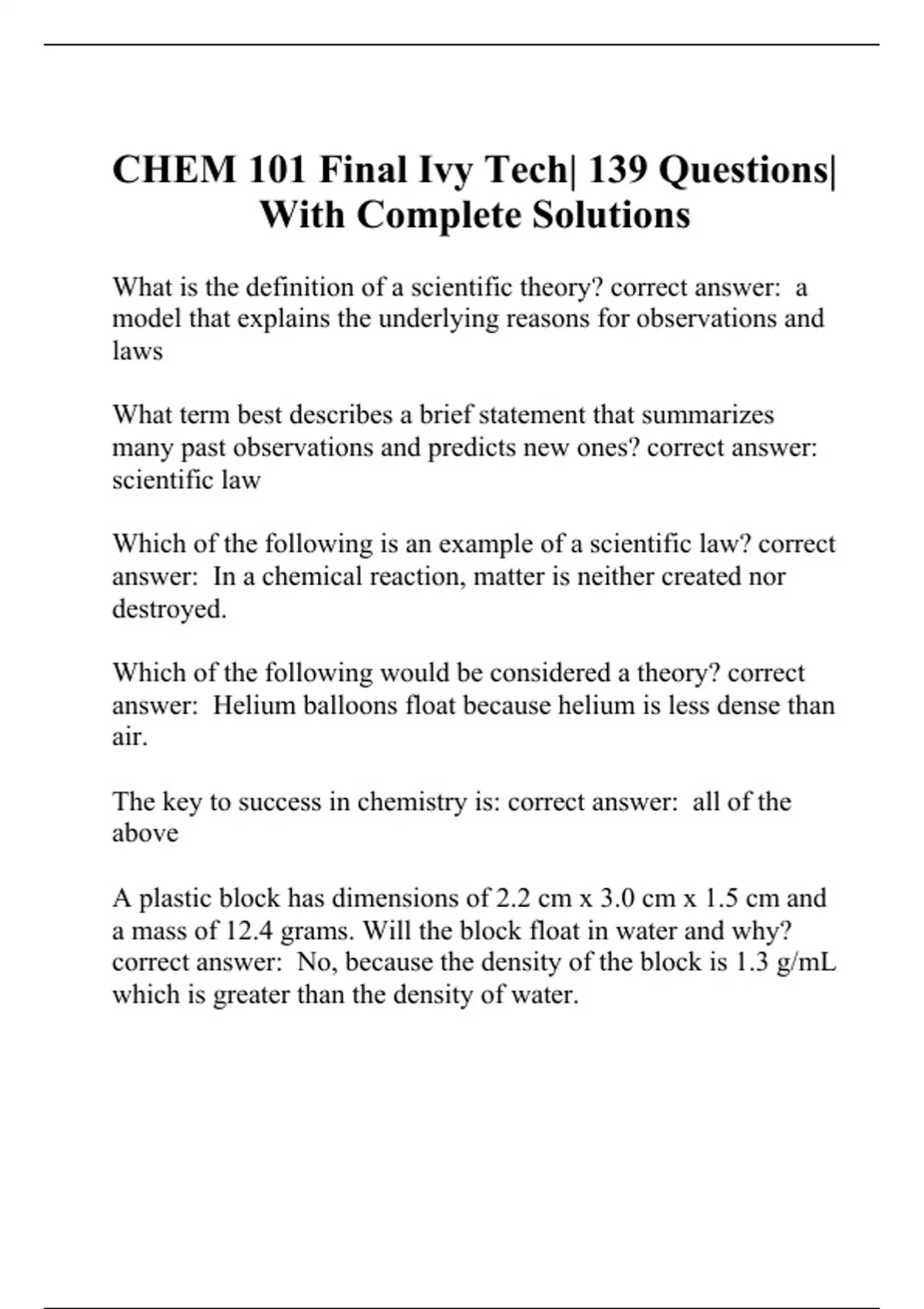 CHEM 101 Final Ivy Tech| 139 Questions| With Complete Solutions