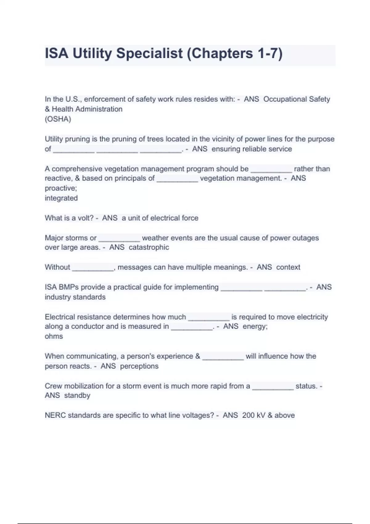 ISA Utility Specialist (Chapters 1-7) All Covered Exam Questions And Answers All Correct In the U.S., enforcement of safety work rules resides with: - ANS Occupational Safety & Health Administration (OSHA) Utility pruning is the pruning of trees located in the vicinity of power lines for the purpose of __________ __________ __________. - ANS ensuring reliable service A comprehensive vegetation management program should be __________ rather than reactive, & based on principals of __________ vegetation management. - ANS proactive; integrated What is a volt? - ANS a unit of electrical force Major storms or __________ weather events are the usual cause of power outages over large areas. - ANS catastrophic Without __________, messages can have multiple meanings. - ANS context ISA BMPs provide a practical guide for implementing __________ __________. - ANS industry standards Electrical resistance determines how much __________ is required to move electricity along a conductor and is measured in __________. - ANS energy; ohms When communicating, a person's experience & __________ will influence how the person reacts. - ANS perceptions Crew mobilization for a storm event is much more rapid from a __________ status. - ANS standby NERC standards are specific to what line voltages? - ANS 200 kV & above An important first step in any vegetation management program should be to asses system conditions, which is often done through an __________. - ANS inventory Which type of cuts are less unacceptable? - ANS internodal cuts (e.g. topping) A worker neglecting to wear cut-resistant chaps while operating a chainsaw is committing an unsafe __________, while an employer failing to provide chaps is creating an unsafe __________. - ANS act; condition A conductor carrying more than __________ volts would be considered a NERC line. - ANS 200,000 Communication is both verbal & nonverbal. When a customer is confronted with contradictory information, the person will usually believe the __________ message. - ANS nonverbal Voluntary safety standards for pruning, trimming, repairing, maintaining & removing trees, & cutting brush: - ANS ANSI Z133 NERC standards require the reporting of all tree caused outages by __________ categories - ANS three A traditional cycle will schedule maintenance __________ trees grow into conductors. - ANS before Which type of cuts are more acceptable? - ANS nodal cuts (e.g. drop-crotch, thinning) The __________-__________ rule suggests that workers should take time before starting a job to check for potentially unsafe conditions & discuss them. - ANS two-minute According to ANSI Z133, the minimum approach distance for persons other than qualified line-clearance arborists for 50 kV & less is __________. - ANS 10 feet Trees growing into contact with a single-phase distribution conductor pose __________ threat of a tree-ground fault. - ANS little Where should the final cut be made for proper utility pruning? - ANS just outside of the branch bark ridge and the branch collar A vegetation management scheduling unit may be an entire __________ or a __________ __________. - ANS circuit; geographical area 2 examples of protective equipment: - ANS circuit breakers lightning receptors On a storm site, cutting should not begin until all risks have been assessed & the __________ approach has been decided & adopted. - ANS safest