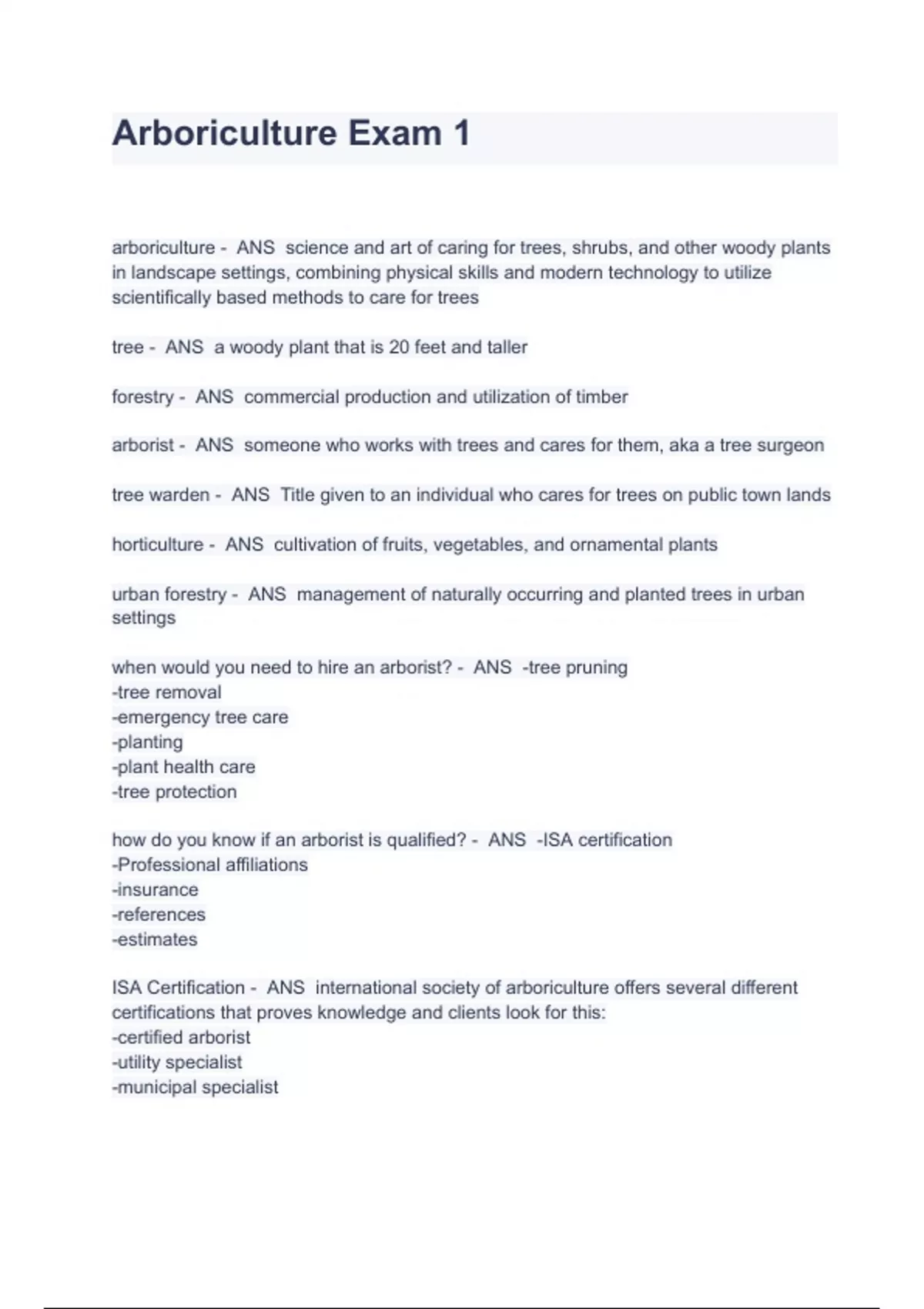 Arboriculture Exam 1 All Questions Included (Answered) arboriculture - ANS science and art of caring for trees, shrubs, and other woody plants in landscape settings, combining physical skills and modern technology to utilize scientifically based methods to care for trees tree - ANS a woody plant that is 20 feet and taller forestry - ANS commercial production and utilization of timber arborist - ANS someone who works with trees and cares for them, aka a tree surgeon tree warden - ANS Title given to an individual who cares for trees on public town lands horticulture - ANS cultivation of fruits, vegetables, and ornamental plants urban forestry - ANS management of naturally occurring and planted trees in urban settings when would you need to hire an arborist? - ANS -tree pruning -tree removal -emergency tree care -planting -plant health care -tree protection how do you know if an arborist is qualified? - ANS -ISA certification -Professional affiliations -insurance -references -estimates ISA Certification - ANS international society of arboriculture offers several different certifications that proves knowledge and clients look for this: -certified arborist -utility specialist -municipal specialist -certified tree worker -board certified master arborist TCIA - ANS Tree Care Industry Association ASCA - ANS American Society of Consulting Arborists what arboriculture groups are there in MA? - ANS -Massachusetts Arborists Association -Massachusetts Tree Wardens and Foresters Association tree topping - ANS an improper method of pruning that involves removing whole tops or trees/large branches, makes tree lose too much plant material at once when is it okay to use tree spikes? - ANS -during tree removal -in rescue/emergency situati
