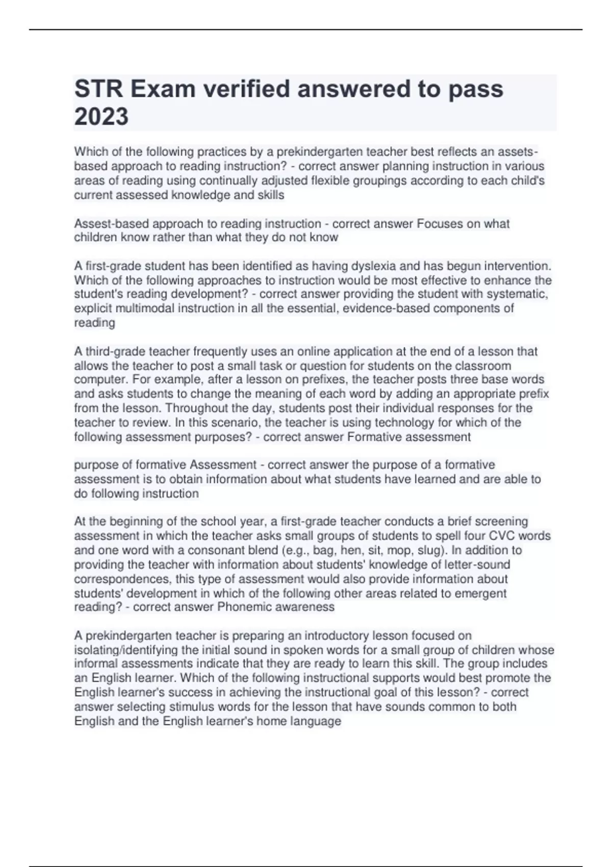 STR Exam verified answered to pass 2023Which of the following practices by a prekindergarten teacher best reflects an assets-based approach to reading instruction? planning instruction in various areas of reading using continually adjusted flexible groupings according to each child's current assessed knowledge and skills Assest-based approach to reading instruction Focuses on what children know rather than what they do not know A first-grade student has been identified as having dyslexia and has begun intervention. Which of the following approaches to instruction would be most effective to enhance the student's reading development? providing the student with systematic, explicit multimodal instruction in all the essential, evidence-based components of reading A third-grade teacher frequently uses an online application at the end of a lesson that allows the teacher to post a small task or question for students on the classroom computer. For example, after a lesson on prefixes, the teacher posts three base words and asks students to change the meaning of each word by adding an appropriate prefix from the lesson. Throughout the day, students post their individual responses for the teacher to review. In this scenario, the teacher is using technology for which of the following assessment purposes? Formative assessment purpose of formative Assessment the purpose of a formative assessment is to obtain information about what students have learned and are able to do following instruction At the beginning of the school year, a first-grade teacher conducts a brief screening assessment in which the teacher asks small groups of students to spell four CVC words and one word with a consonant blend (e.g., bag, hen, sit, mop, slug). In addition to providing the teacher with information about students' knowledge of letter-sound correspondences, this type of assessment would also provide information about students' development in which of the following other areas related to emergent reading? Phonemic awareness A prekindergarten teacher is preparing an introductory lesson focused on isolating/identifying the initial sound in spoken words for a small group of children whose informal assessments indicate that they are ready to learn this skill. The group includes an English learner. Which of the following instructional supports would best promote the English learner's success in achieving the instructional goal of this lesson? selecting stimulus words for the lesson that have sounds common to both English and the English learner's home language As part of an informal assessment of students' phonemic awareness skills, a kindergarten teacher meets with individual students and says