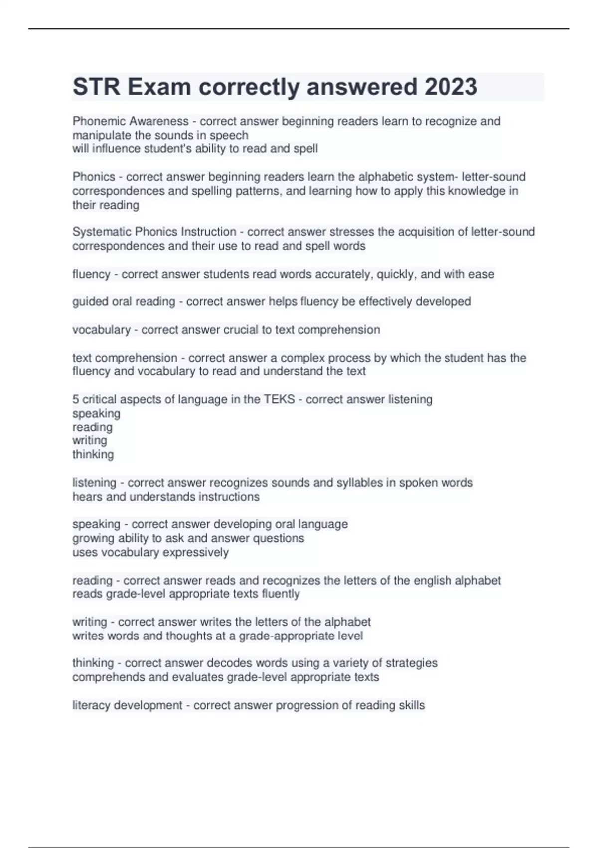 STR Exam correctly answered 2023 | 100% verified Phonemic Awareness - correct answer beginning readers learn to recognize and manipulate the sounds in speech will influence student's ability to read and spell Phonics - correct answer beginning readers learn the alphabetic system- letter-sound correspondences and spelling patterns, and learning how to apply this knowledge in their reading Systematic Phonics Instruction - correct answer stresses the acquisition of letter-sound correspondences and their use to read and spell words fluency - correct answer students read words accurately, quickly, and with ease guided oral reading - correct answer helps fluency be effectively developed vocabulary - correct answer crucial to text comprehension text comprehension - correct answer a complex process by which the student has the fluency and vocabulary to read and understand the text 5 critical aspects of language in the TEKS - correct answer listening speaking reading writing thinking listening - correct answer recognizes sounds and syllables in spoken words