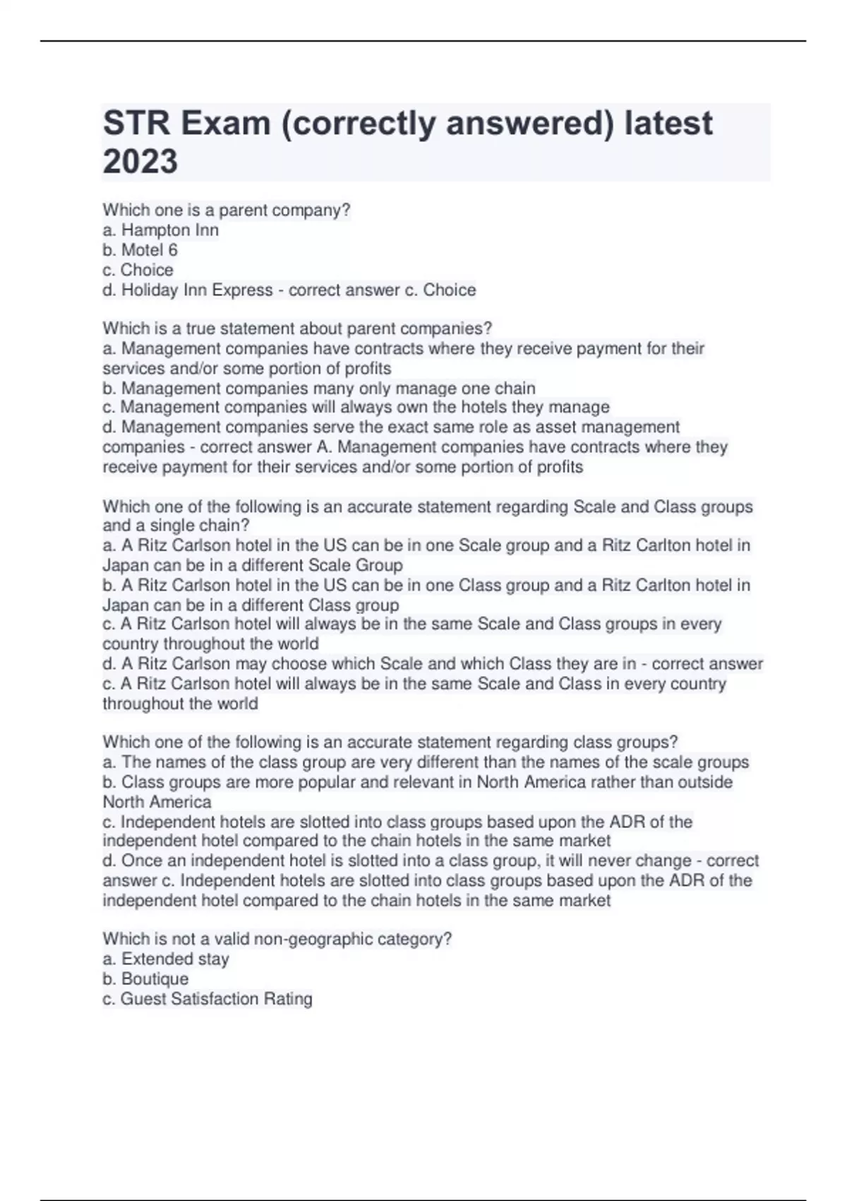 STR Exam (correctly answered) latest 2023| 100% Verified Which one is a parent company? a. Hampton Inn b. Motel 6 c. Choice d. Holiday Inn Express - correct answer c. Choice Which is a true statement about parent companies? a. Management companies have contracts where they receive payment for their services and/or some portion of profits b. Management companies many only manage one chain c. Management companies will always own the hotels they manage d. Management companies serve the exact same role as asset management companies - correct answer A. Management companies have contracts where they receive payment for their services and/or some portion of profits Which one of the following is an accurate statement regarding Scale and Class groups and a single chain? a. A Ritz Carlson hotel in the US can be in one Scale group and a Ritz Carlton hotel in Japan can be in a different Scale Group b. A Ritz Carlson hotel in the US can be in one Class group and a Ritz Carlton hotel in Japan can be in a different Class group c. A Ritz Carlson hotel will always be in the same Scale and Class groups in every country throughout the world d. A Ritz Carlson may choose which Scale and which Class they are in - correct answer c. A Ritz Carlson hotel will always be in the same Scale and Class in every country throughout the world Which one of the following is an accurate statement regarding class groups? a. The names of the class group are very different than the names of the scale groups b. Class groups are more popular and relevant in North America rather than outside North America c. Independent hotels are slotted into class groups based upon the ADR of the independent hotel compared to the chain hotels in the same market d. Once an independent hotel is slotted into a class group, it will never change - correct answer c. Independent hotels are slotted into class groups based upon the ADR of the independent hotel compared to the chain hotels in the same market Which is not a valid non-geographic category? a. Extended stay b. Boutique c. Guest Satisfaction Rating
