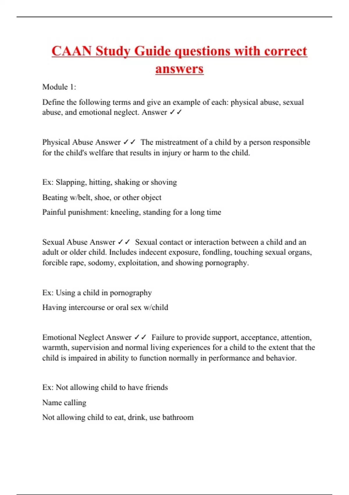 Module 1: Define the following terms and give an example of each: physical abuse, sexual abuse, and emotional neglect. Answer Physical Abuse Answer The mistreatment of a child by a person responsible for the child's welfare that results in injury or harm to the child. Ex: Slapping, hitting, shaking or shoving Beating w/belt, shoe, or other object Painful punishment: kneeling, standing for a long time Sexual Abuse Answer Sexual contact or interaction between a child and an adult or older child. Includes indecent exposure, fondling, touching sexual organs, forcible rape, sodomy, exploitation, and showing pornography. Ex: Using a child in pornography Having intercourse or oral sex w/child Emotional Neglect Answer Failure to provide support, acceptance, attention, warmth, supervision and normal living experiences for a child to the extent that the child is impaired in ability to function normally in performance and behavior. Ex: Not allowing child to have friends Name calling