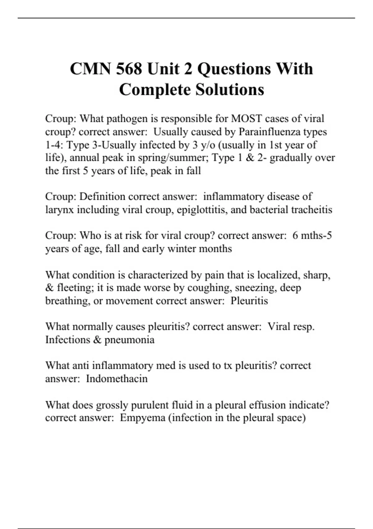Croup: What pathogen is responsible for MOST cases of viral croup? correct answer: Usually caused by Parainfluenza types 1-4: Type 3-Usually infected by 3 y/o (usually in 1st year of life), annual peak in spring/summer; Type 1 & 2- gradually over the first 5 years of life, peak in fall Croup: Definition correct answer: inflammatory disease of larynx including viral croup, epiglottitis, and bacterial tracheitis Croup: Who is at risk for viral croup? correct answer: 6 mths-5 years of age, fall and early winter months What condition is characterized by pain that is localized, sharp, & fleeting; it is made worse by coughing, sneezing, deep breathing, or movement correct answer: Pleuritis What normally causes pleuritis? correct answer: Viral resp. Infections & pneumonia What anti inflammatory med is used to tx pleuritis? correct answer: Indomethacin What does grossly purulent fluid in a pleural effusion indicate? correct answer: Empyema (infection in the pleural space)