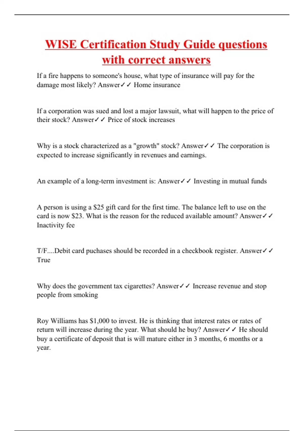 If a fire happens to someone's house, what type of insurance will pay for the damage most likely? Answer Home insurance If a corporation was sued and lost a major lawsuit, what will happen to the price of their stock? Answer Price of stock increases Why is a stock characterized as a "growth" stock? Answer The corporation is expected to increase significantly in revenues and earnings. An example of a long-term investment is: Answer Investing in mutual funds A person is using a $25 gift card for the first time. The balance left to use on the card is now $23. What is the reason for the reduced available amount? Answer Inactivity fee T/F....Debit card puchases should be recorded in a checkbook register. Answer True Why does the government tax cigarettes? Answer Increase revenue and stop people from smoking Roy Williams has $1,000 to invest. He is thinking that interest rates or rates of return will increase during the year. What should he buy? Answer He should buy a certificate of deposit that is will mature either in 3 mo