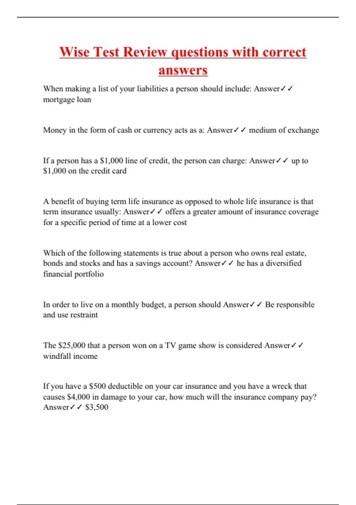 When making a list of your liabilities a person should include: Answer mortgage loan Money in the form of cash or currency acts as a: Answer medium of exchange If a person has a $1,000 line of credit, the person can charge: Answer up to $1,000 on the credit card A benefit of buying term life insurance as opposed to whole life insurance is that term insurance usually: Answer offers a greater amount of insurance coverage for a specific period of time at a lower cost Which of the following statements is true about a person who owns real estate, bonds and stocks and has a savings account? Answer he has a diversified financial portfolio In order to live on a monthly budget, a person should Answer Be responsible and use restraint The $25,000 that a person won on a TV game show is considered Answer windfall income If you have a $500 deductible on your car insurance and you have a wreck that causes $4,000 in damage to your car, how much will the insurance company pay? Answer $3,500