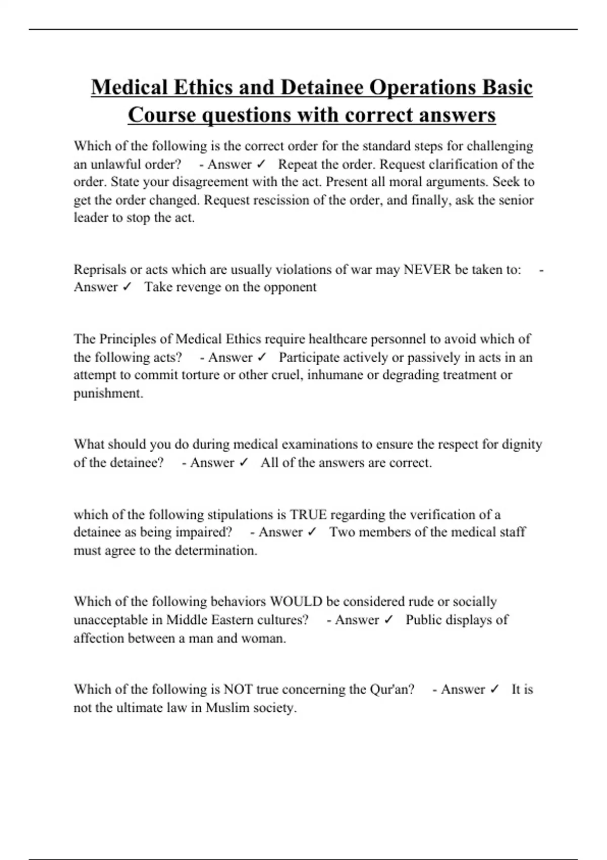Which of the following is the correct order for the standard steps for challenging an unlawful order? - Answer Repeat the order. Request clarification of the order. State your disagreement with the act. Present all moral arguments. Seek to get the order changed. Request rescission of the order, and finally, ask the senior leader to stop the act. Reprisals or acts which are usually violations of war may NEVER be taken to: - Answer Take revenge on the opponent The Principles of Medical Ethics require healthcare personnel to avoid which of the following acts? - Answer Participate actively or passively in acts in an attempt to commit torture or other cruel, inhumane or degrading treatment or punishment. What should you do during medical examinations to ensure the respect for dignity of the detainee? - Answer All of the answers are correct. which of the following stipulations is TRUE regarding the verification of a detainee as being impaired? - Answer Two members of the medical staff must agree to the determination. Which of the following behaviors WOULD be considered rude or socially unacceptable in Middle Eastern cultures? - Answer Public displays of affection between a man and woman.