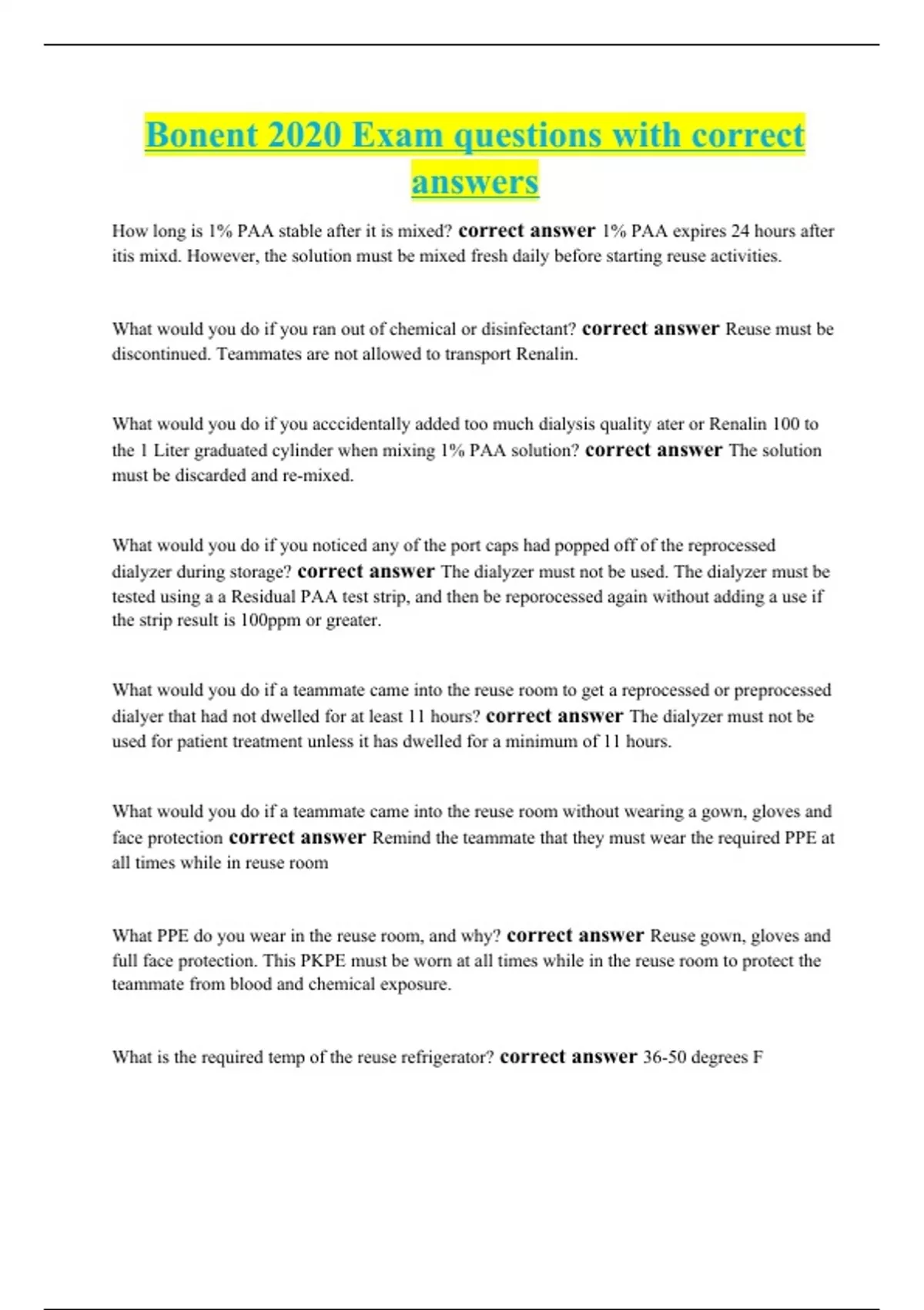 How long is 1% PAA stable after it is mixed? correct answer 1% PAA expires 24 hours after itis mixd. However, the solution must be mixed fresh daily before starting reuse activities. What would you do if you ran out of chemical or disinfectant? correct answer Reuse must be discontinued. Teammates are not allowed to transport Renalin. What would you do if you acccidentally added too much dialysis quality ater or Renalin 100 to the 1 Liter graduated cylinder when mixing 1% PAA solution? correct answer The solution must be discarded and re-mixed. What would you do if you noticed any of the port caps had popped off of the reprocessed dialyzer during storage? correct answer The dialyzer must not be used. The dialyzer must be tested using a a Residual PAA test strip, and then be reporocessed again without adding a use if the strip result is 100ppm or greater. What would you do if a teammate came into the reuse room to get a reprocessed or preprocessed dialyer that had not dwelled for at least 11 hours? correct answer The dialyzer must not be used for patient treatment unless it has dwelled for a minimum of 11 hours. What would you do if a teammate came into the reuse room without wearing a gown, gloves and face protection correct answer Remind the teammate that they must wear the required PPE at all times while in reuse room What PPE do you wear in the reuse room, and why? correct answer Reuse gown, gloves and full face protection. This PKPE must be worn at all times while in the reuse room to protect the teammate from blood and chemical exposure. What is the required temp of the reuse refrigerator? co