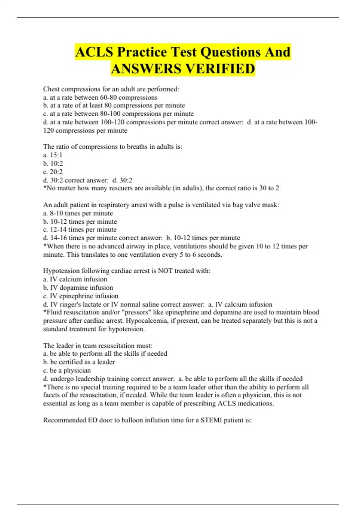 ACLS Practice Test Questions And ANSWERS VERIFIED