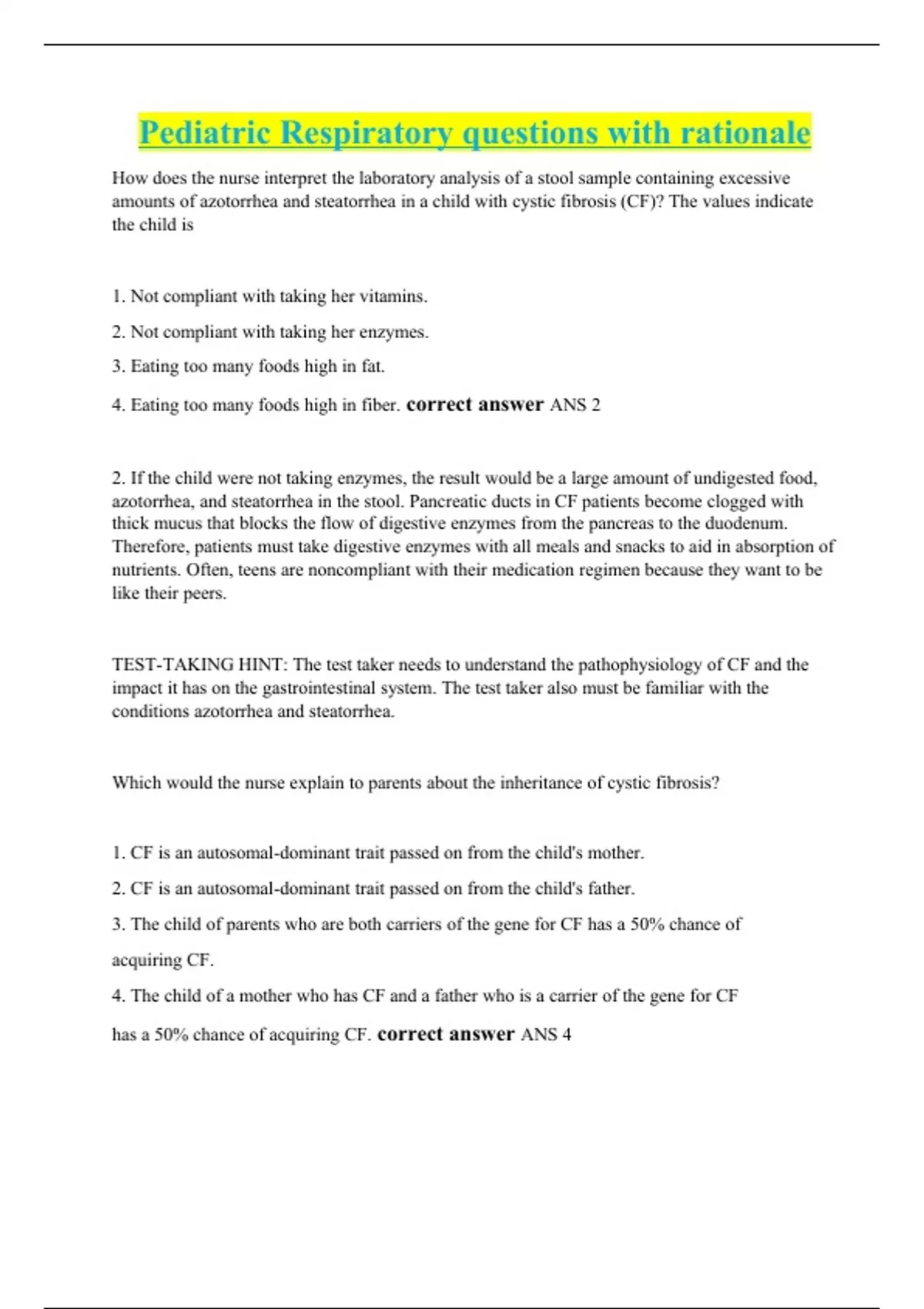 How does the nurse interpret the laboratory analysis of a stool sample containing excessive amounts of azotorrhea and steatorrhea in a child with cystic fibrosis (CF)? The values indicate the child is 1. Not compliant with taking her vitamins. 2. Not compliant with taking her enzymes. 3. Eating too many foods high in fat. 4. Eating too many foods high in fiber. correct answer ANS 2 2. If the child were not taking enzymes, the result would be a large amount of undigested food, azotorrhea, and steatorrhea in the stool. Pancreatic ducts in CF patients become clogged with thick mucus that blocks the flow of digestive enzymes from the pancreas to the duodenum. Therefore, patients must take digestive enzymes with all meals and snacks to aid in absorption of nutrients. Often, teens are noncompliant with their medication regimen because they want to be like their peers. TEST-TAKING HINT: The test taker needs to understand the pathophysiology of CF and the impact it has on the gastrointestinal system. The test taker also must be familiar with the conditions azotorrhea and steatorrhea. Which would the nurse explain to parents about the inheritance of cystic fibrosis? 1. CF is an autosomal-dominant trait passed on from the child's mother. 2. CF is an autosomal-dominant trait passed on from the child's father. 3. The child of parents who are both carriers of the gene for CF has a 50% chance of acquiring CF. 4. The child of a mother who has CF and a father who is a carrier