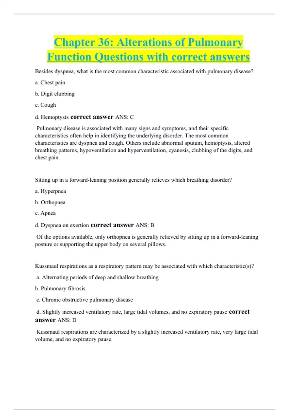 Besides dyspnea, what is the most common characteristic associated with pulmonary disease? a. Chest pain b. Digit clubbing c. Cough d. Hemoptysis correct answer ANS: C Pulmonary disease is associated with many signs and symptoms, and their specific characteristics often help in identifying the underlying disorder. The most common characteristics are dyspnea and cough. Others include abnormal sputum, hemoptysis, altered breathing patterns, hypoventilation and hyperventilation, cyanosis, clubbing of the digits, and chest pain. Sitting up in a forward-leaning position generally relieves which breathing disorder? a. Hyperpnea b. Orthopnea c. Apnea d. Dyspnea on exertion correct answer ANS: B Of the options available, only orthopnea is generally relieved by sitting up in a forward-leaning posture or supporting the upper body on several pillows. Kussmaul respirations as a respiratory pattern may be associated with which characteristic(s)? a. Alternating periods of deep and shallow breathing b. Pulmonary fibrosis c. Chronic obstructive pulmonary disease d. Slightly increased ventilatory rate, large tidal volumes, and no expiratory pause correct answer ANS: D Kussmaul respirations are characterized by a slightly increased ventilatory rate, very large tidal volume, and no expiratory pause.